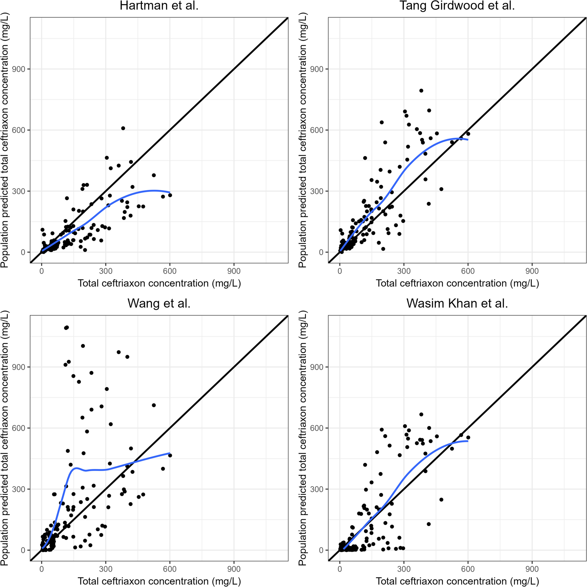 Goodness of fit of predicted intravenous total ceftriaxone concentrations. Observed total ceftriaxone concentrations versus population predictions; the black line represents the line of identity and the blue line represents the locally estimated scatterplot smoothing (LOESS) line, which follows the highest density of the measured total ceftriaxone concentration and predictions