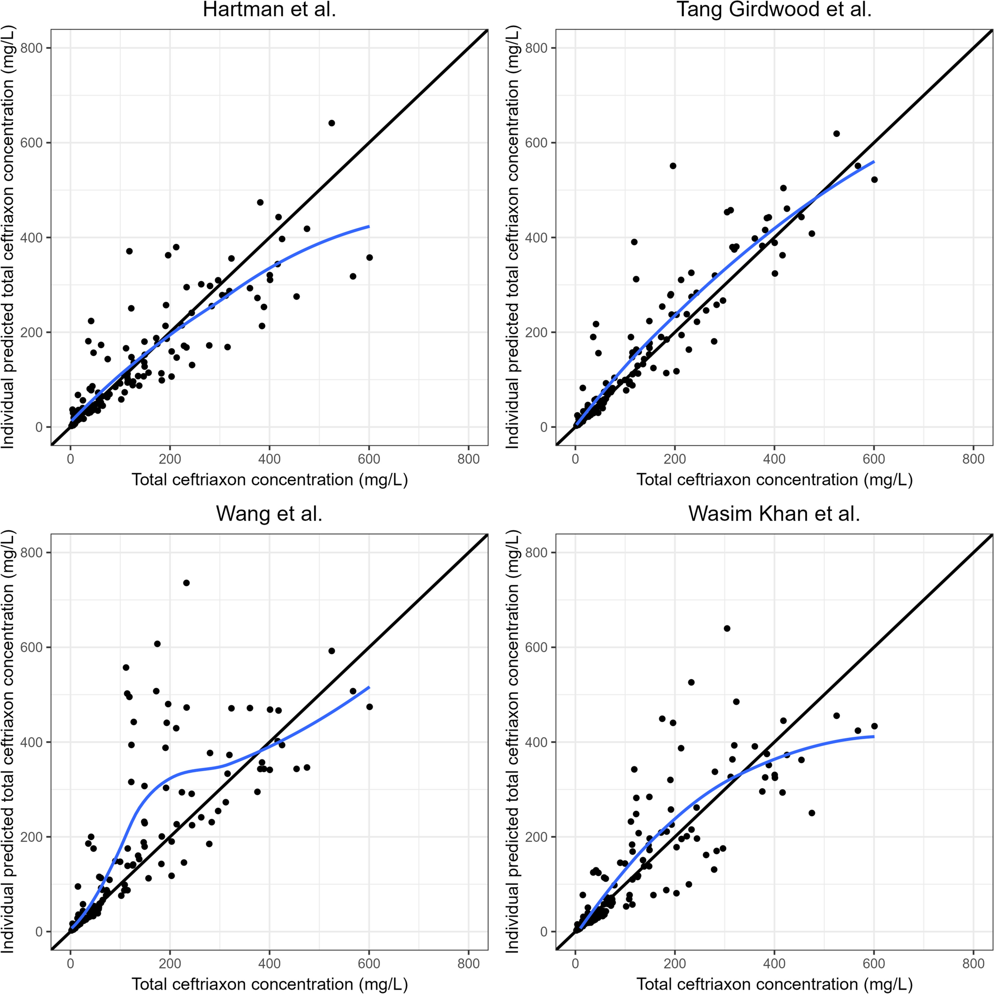 Goodness of fit of individual predicted total intravenous ceftriaxone concentrations. Observed total ceftriaxone concentrations versus individual predictions; the black line represents the line of identity and the blue line represents the LOESS line (locally estimated scatterplot smoothing), which follows the highest density of the measured total ceftriaxone concentration and predictions