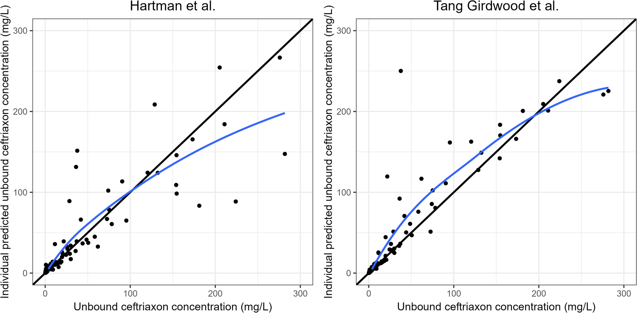 Goodness of fit of individual predicted intravenous unbound ceftriaxone concentrations. Observed unbound ceftriaxone concentrations versus individual predictions; the black line represents the line of identity and the blue line represents the LOESS line (locally estimated scatterplot smoothing), which follows the highest density of the observed unbound ceftriaxone concentration and predictions