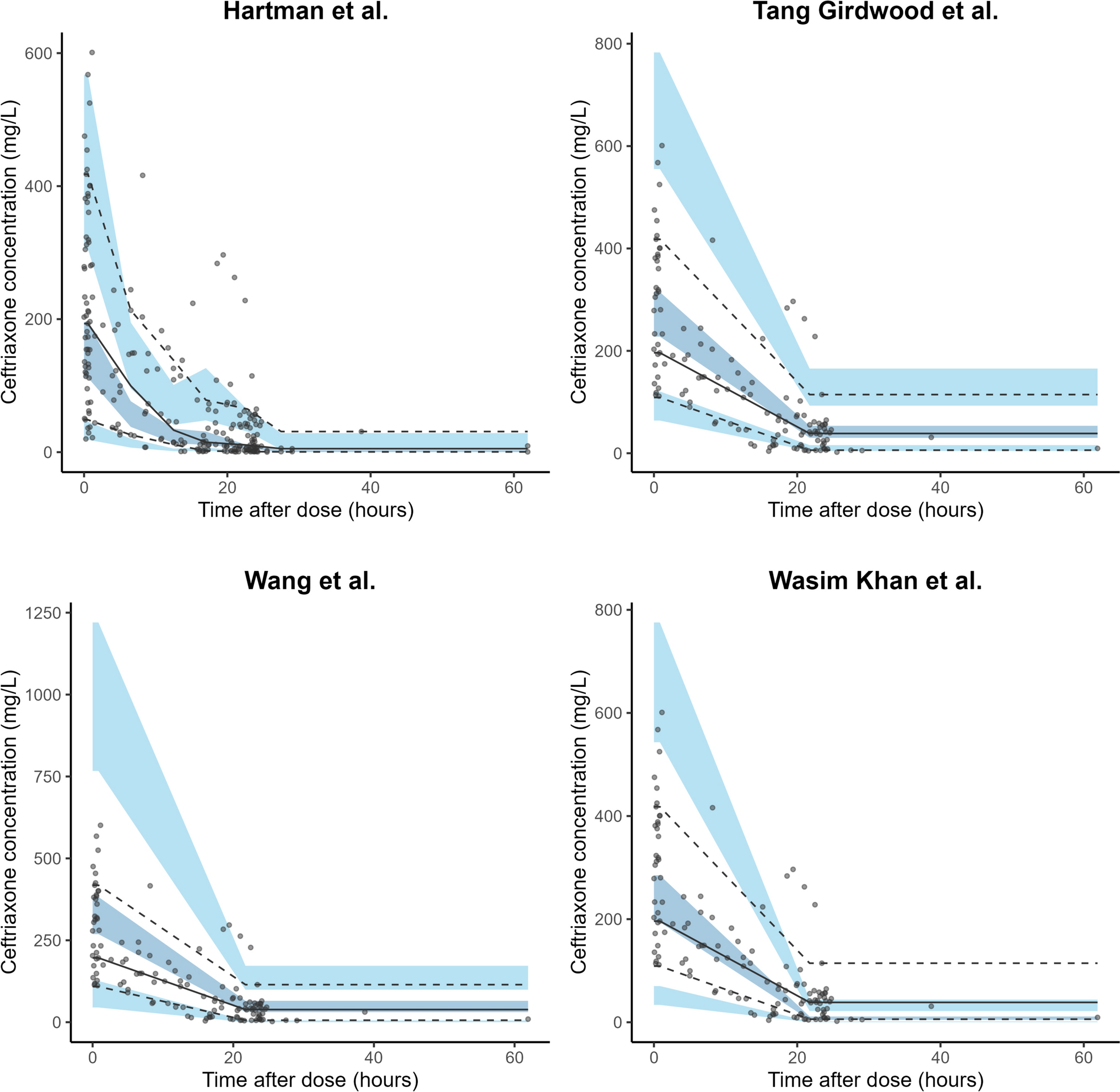 Visual predictive checks of the included popPK models for predicting intravenous total ceftriaxone concentrations (n = 1000). The solid black line represents the median of the measured total clavulanic acid concentrations. The dashed black lines represent the 10th and 90th percentiles of the total ceftriaxone observations. The dark blue shaded areas represent the interval for the median of the model predictions (with 97.5% confidence intervals for these predictions). The light-blue shaded areas represent the 10th and 90th percentiles for the model predictions (both with 97.5% confidence intervals)