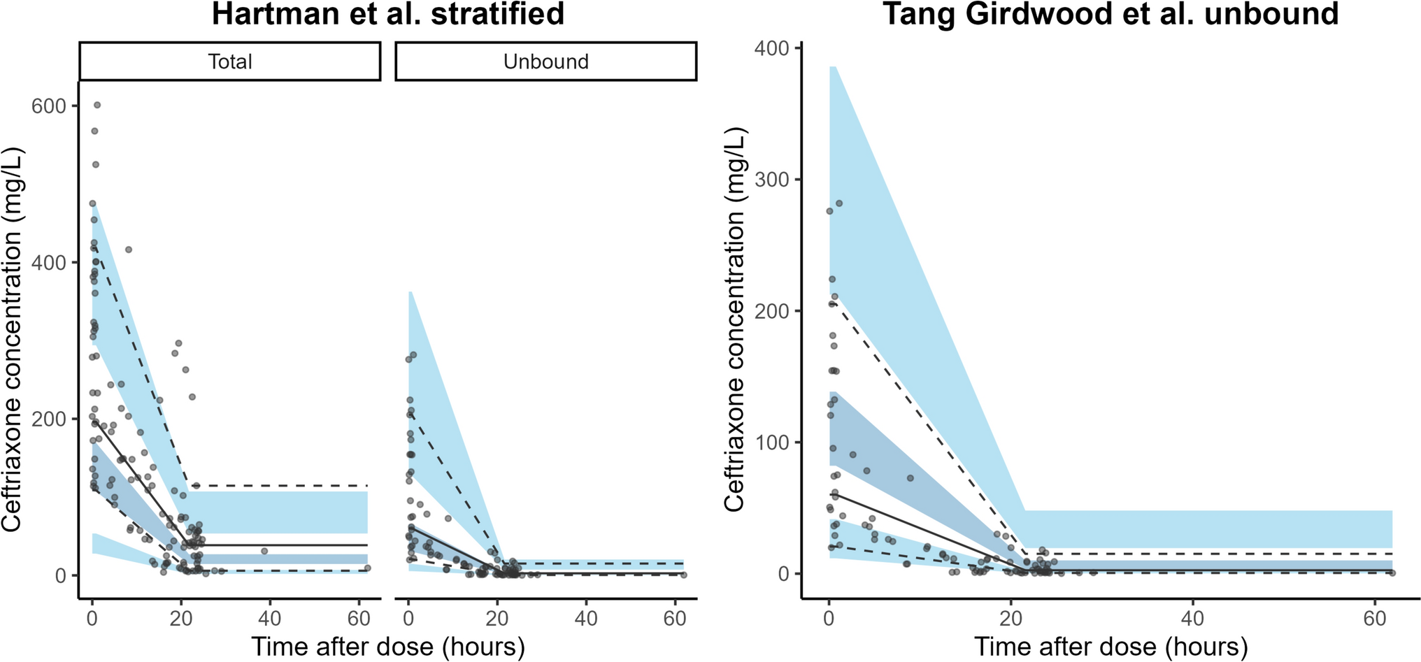 Visual predictive checks of the included pharmacokinetic models for intravenous unbound ceftriaxone concentrations (n = 1000). The solid black line represents the median of the measured ceftriaxone concentrations. The dashed black lines represent the 10th and 90th percentiles of the ceftriaxone observations. The dark blue shaded areas represent the interval for the median of the model predictions (with 97.5% confidence intervals for these predictions). The light blue shaded areas represent the 10th and 90th percentiles for the model predictions (both with 97.5% confidence intervals). A Shows the VPCs for Hartman et al., stratified by route of administration, and B shows the VPCs for Tang Girdwood et al. model of unbound ceftriaxone concentrations (mg/L)