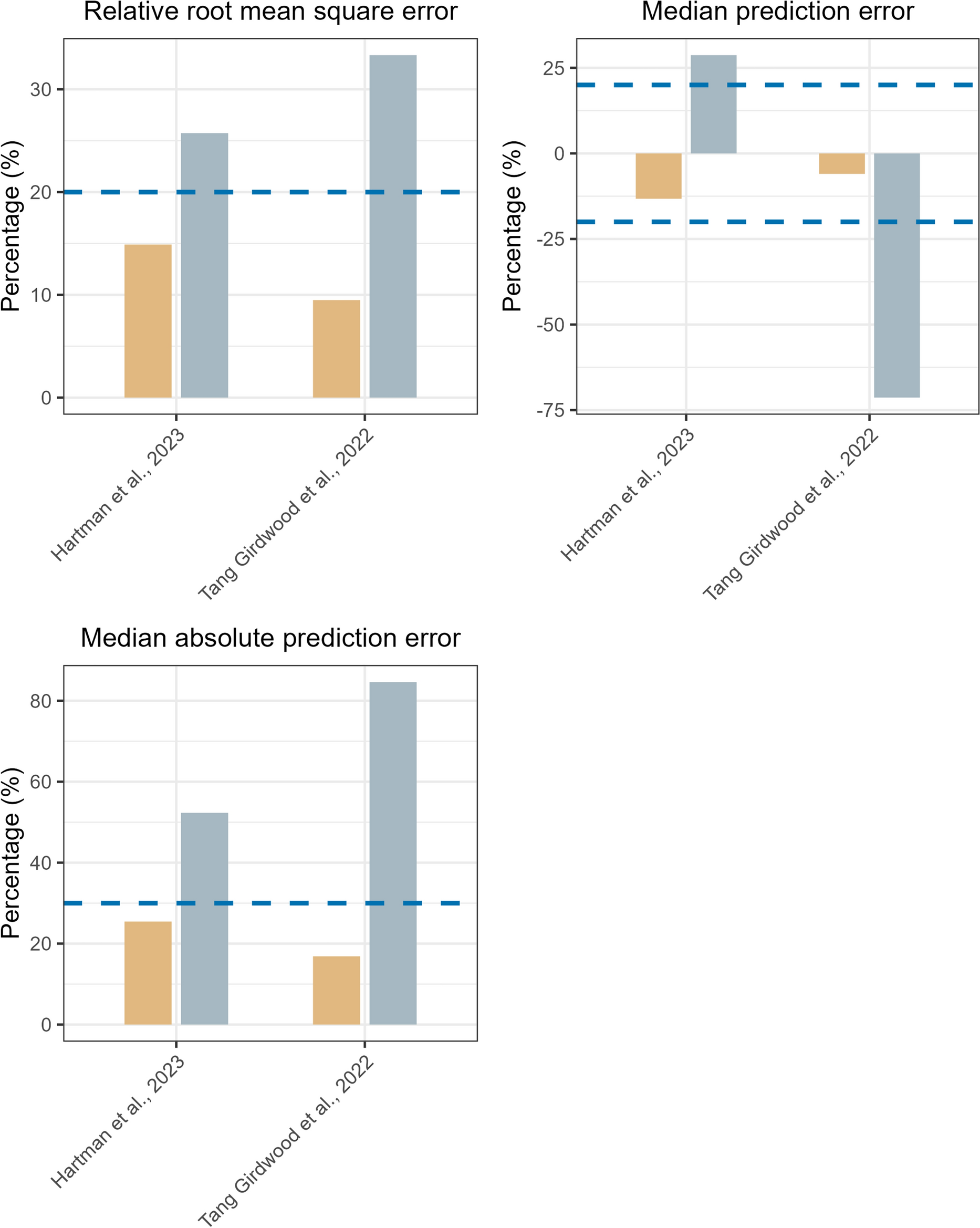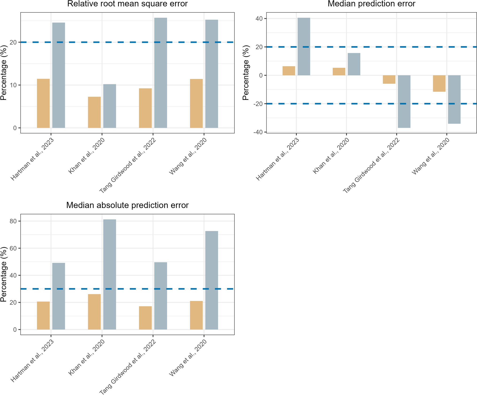 Comparison of the relative root mean square error (rRMSE), median percent error (MDPE), and mean absolute percent error (MAPE) for total ceftriaxone concentrations across the included popPK models. The orange barplots represent the performance metrics for individual predictions (IPRED) and the gray barplots represent the performance metrics for population predictions (PRED). The dashed lines represent criteria for acceptable model predictions, which are 20% for rRMSE, − 20 to 20% for MDPE, and 30% for MAPE