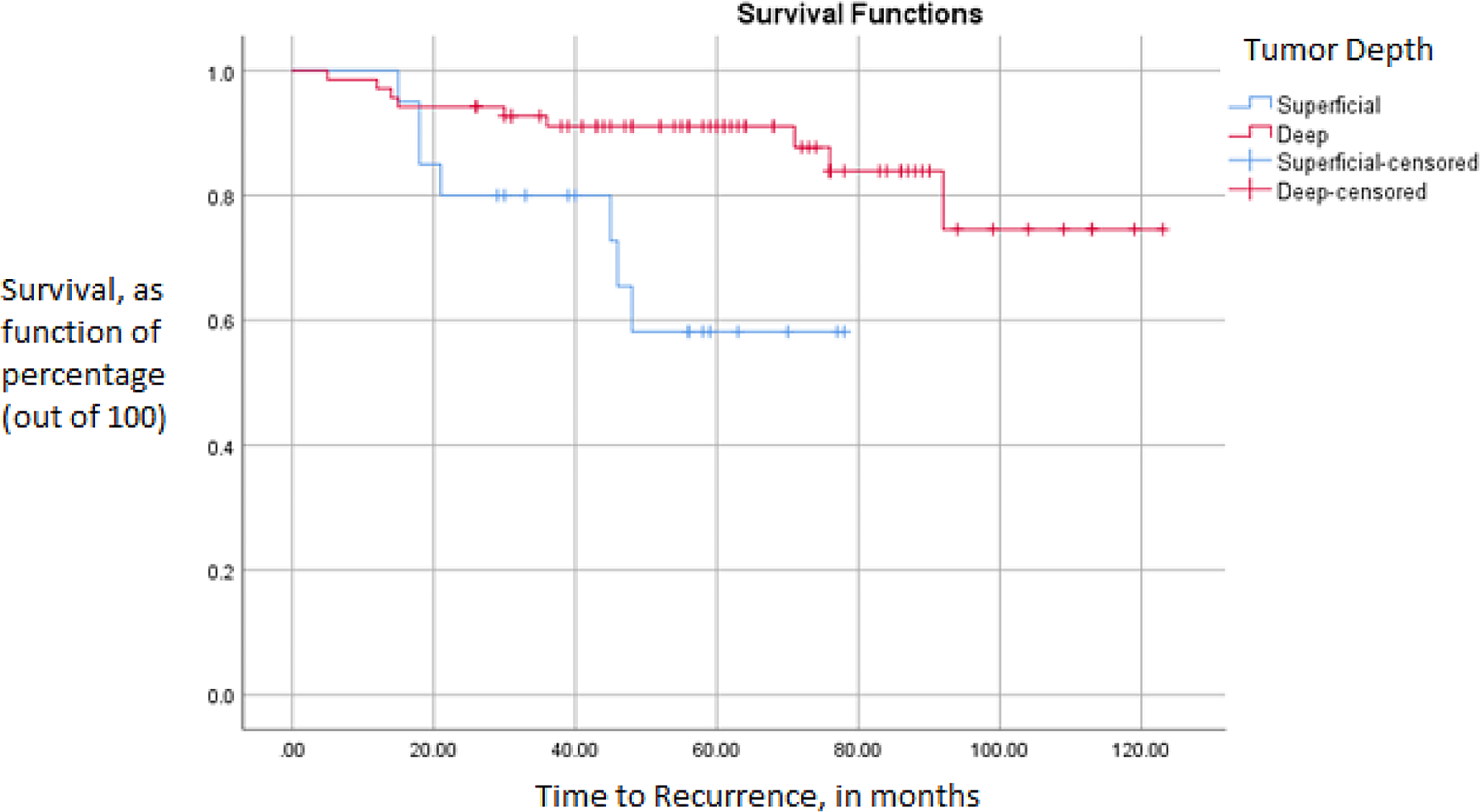 Kaplan-Meier survival showing recurrence-free survival (RFS), based on tumor depth. Rates of 5-year RFS: Deep (91.1%) vs. Superficial (58.2%); p = 0.006. Following a cox-regression hazard model, that utilized a backward step-wise approach (exclusion at p = 0.1), patients with higher tumor depth had lower odds of experiencing a local recurrence (HR 0.26 [95% CI 0.09–0.72]