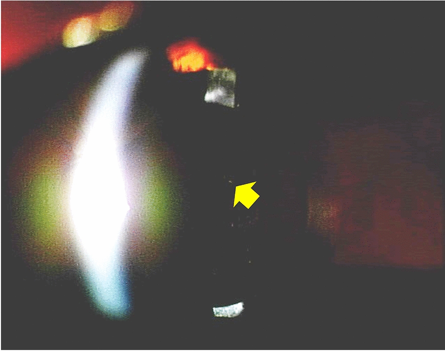 MVs (yellow arrow) observed in the central intraocular lens area under 15 × 4 mm slit illumination