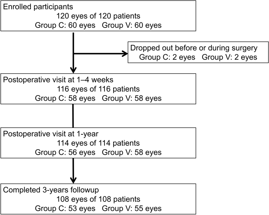 This study enrolled 120 patients (120 eyes). Four patients (four eyes) dropped out before or during surgery (change in the implanted IOL). Subsequently, 116 participants were eligible for analysis, including 58 eyes each in groups C and V. The mean ages of the groups C and V were 70.9 (SD 7.6) and 71.2 (SD 7.7), respectively, with no significant differences (P = 0.87, t test). The ratio of men and women was 25/33 and 22/36, with no differences (P = 0.54, chi-squared test). All IOLs were implanted in the capsule and completely covered the anterior capsule at the end of the surgery. No intraocular or postoperative complications were reported. The changes in the number of participants from enrollment until the 3-year follow-up are summarized in Fig. 2.