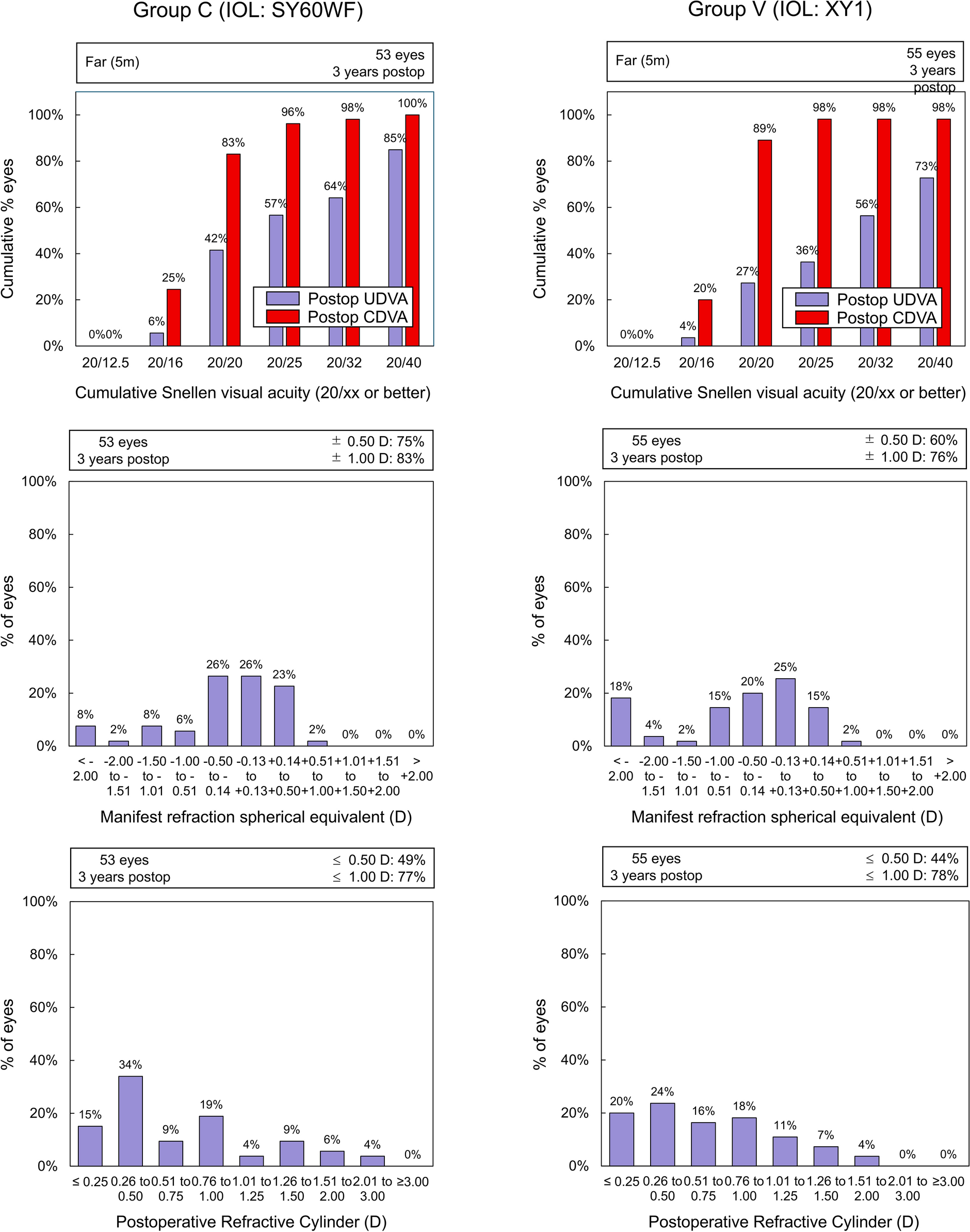 Cumulative percentage of eyes achieving monocular uncorrected (UDVA) and corrected (CDVA) distance visual acuities (top), and distributions of manifest refraction spherical equivalent (middle) and postoperative refractive cylinder (bottom) in groups C and V