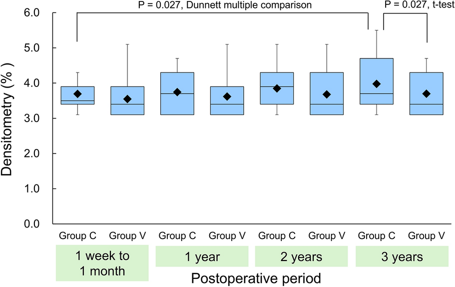 Boxplots of densitometry values indicating surface light scattering on the anterior intraocular lens surfaces in groups C and V. Black diamond denotes mean values. A significant increase was observed in group C at 3-year follow-up (P = 0.027, Dunnett test for multiple comparisons)