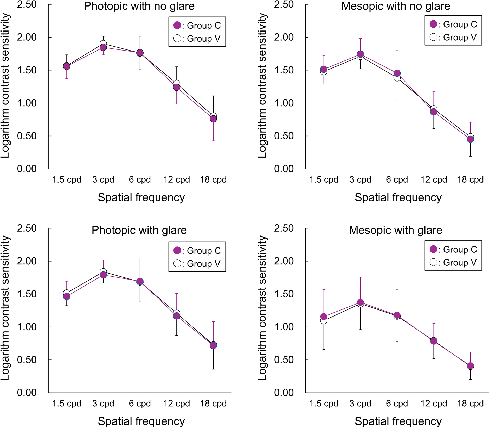 Mean logarithm contrast sensitivities under photopic (left) and mesopic (right) conditions without and with glare (top and bottom, respectively) 3 years postoperatively of eyes implanted with SY60WF (group C) and XY1 (group V)