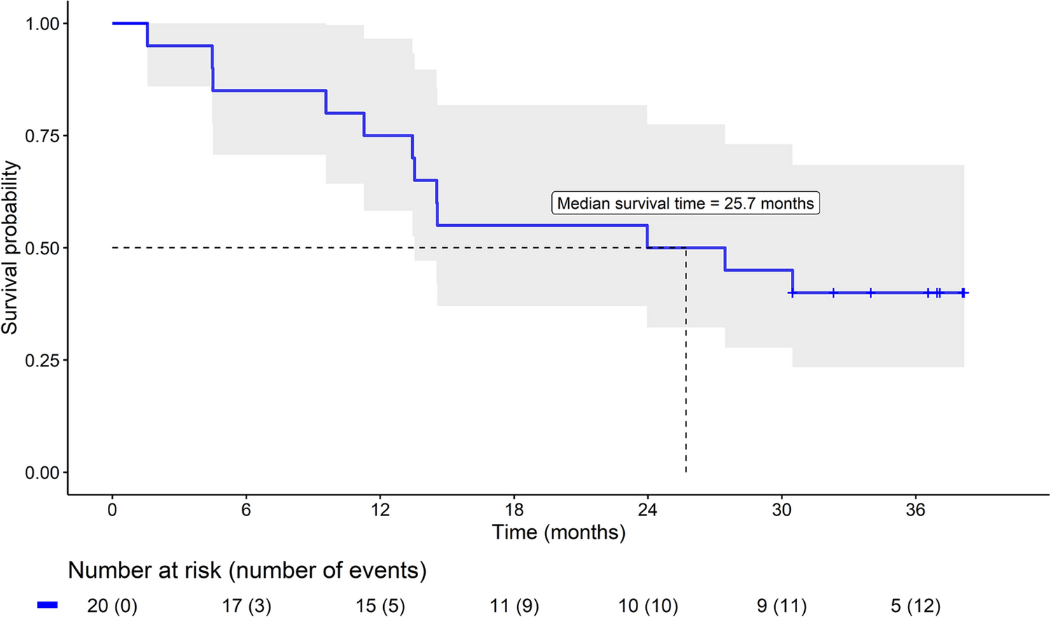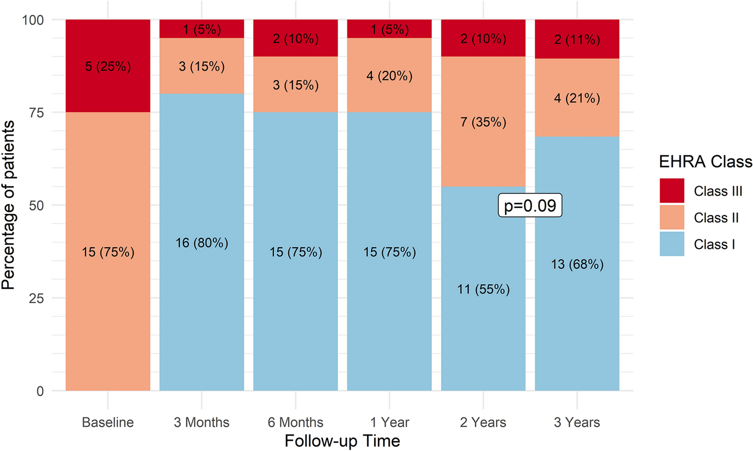 During 3 years of follow-up, the primary safety outcome occurred in 12 (60%) patients while the median time-to-event was 25.7 [12.9–34.6] months (Fig. 4). The most frequently observed secondary safety outcomes were uptitration of antiarrhythmic drugs in 9 (47.5%) patients and electrical cardioversion in 7 patients (35.0%) (Table 5).