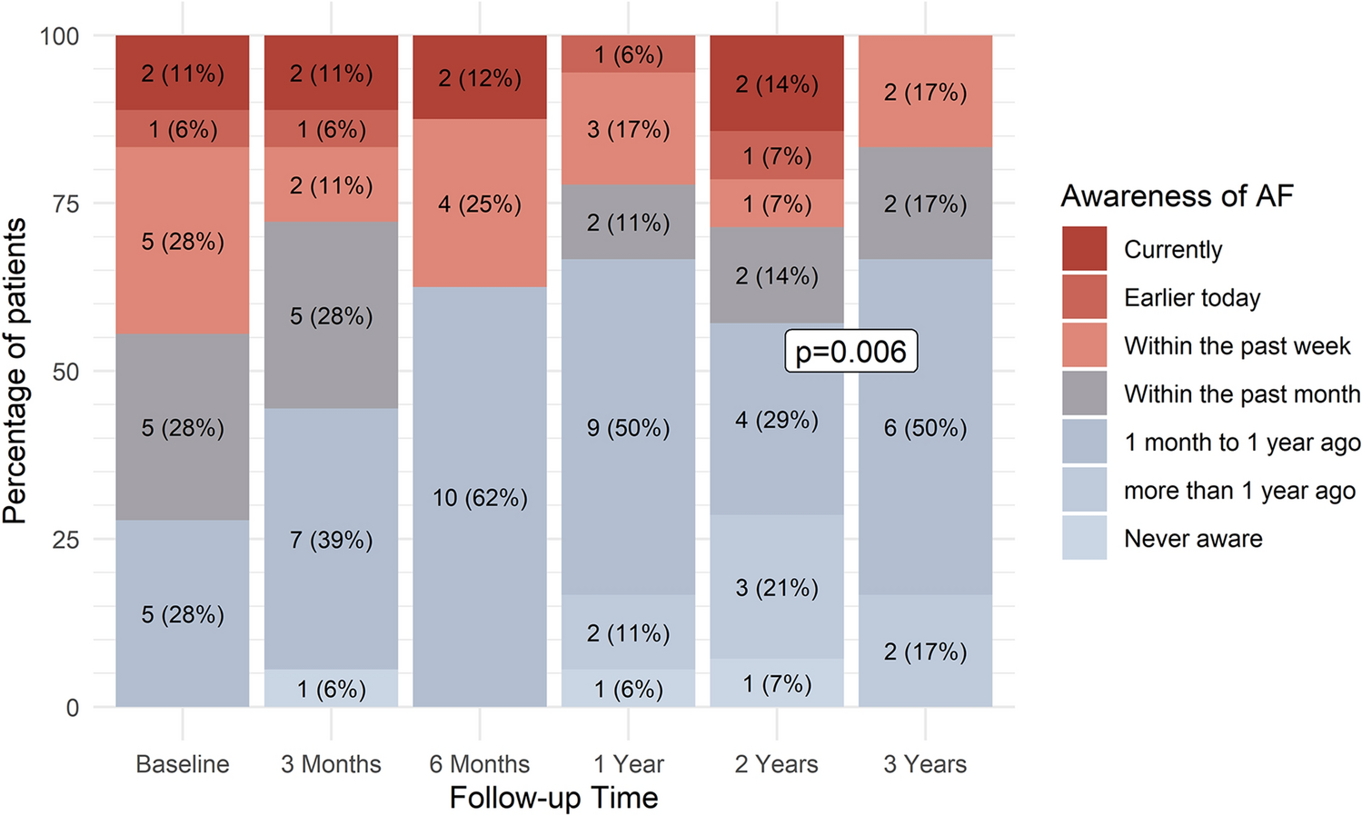 Throughout 3 years of follow-up, we observed a sustained increase in the maximal VRR during episodes of AF as well as in the number of ventricular ectopic beats (during 24-h Holter monitoring). While these numbers cannot be readily explained, these findings could potentially be related to progression in AF severity over time, to a change in classes of prescribed antiarrhythmic drugs or a change in patient adherence to antiarrhythmic medication.