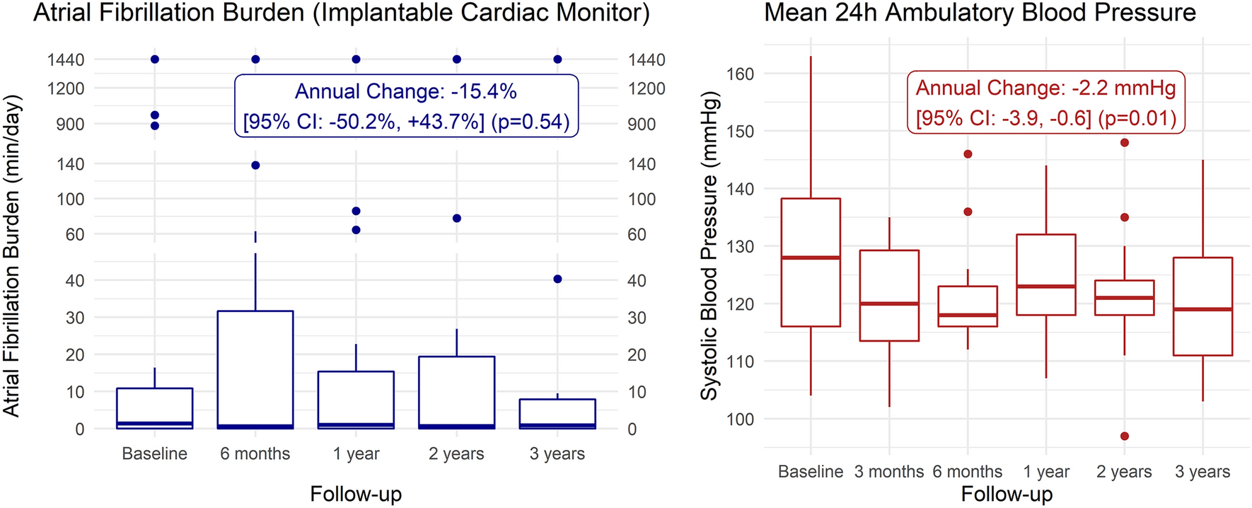 A total of 20 patients with a median age [25th–75th percentiles] of 66.2 [61.2–70.8] years (55% female) were included. At baseline, office BP ± standard deviation (SD) was 153.8/87.5 ± 15.2/10.4 mmHg, while mean 24-h ambulatory BP was 129.5/77.3 ± 15.5/9.3 mmHg. Baseline daily AF burden was 1.4 [0.0–10.9] minutes/day and throughout a 3-year follow-up period, no significant change was observed (− 15.4%/year; 95% confidence interval (CI) − 50.2%, + 43.7%; p = 0.54). The number of defined daily doses of antiarrhythmic drugs and antihypertensive drugs remained stable over time, while mean 24-h ambulatory systolic BP decreased with − 2.2 (95% CI − 3.9, − 0.6; p = 0.01) mmHg/year.