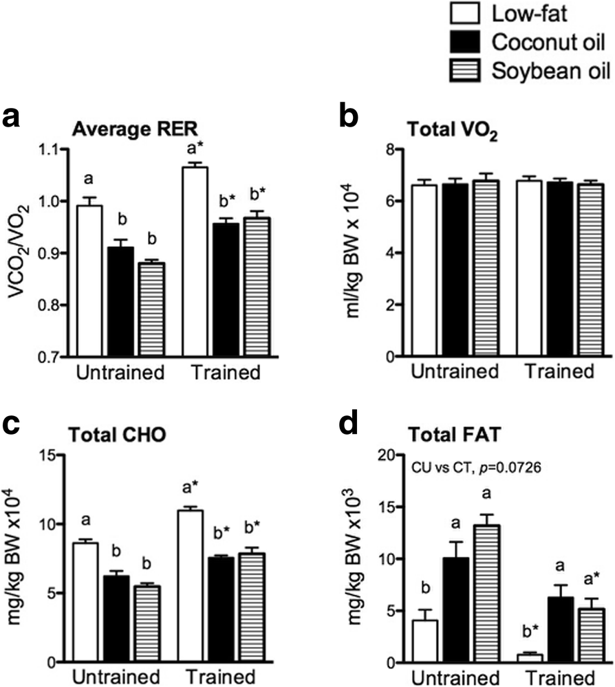 The objective of the study was to update the current knowledge of physiological adaptations occurring during exercise training with low-fat diet, and medium-fat diets containing coconut oil or soybean oil specifically on whole-body metabolism at rest and during exercise, substrate metabolism, mitochondrial functions, and genetic adaptive responses in the muscle and liver under the treadmill exercise modality.
