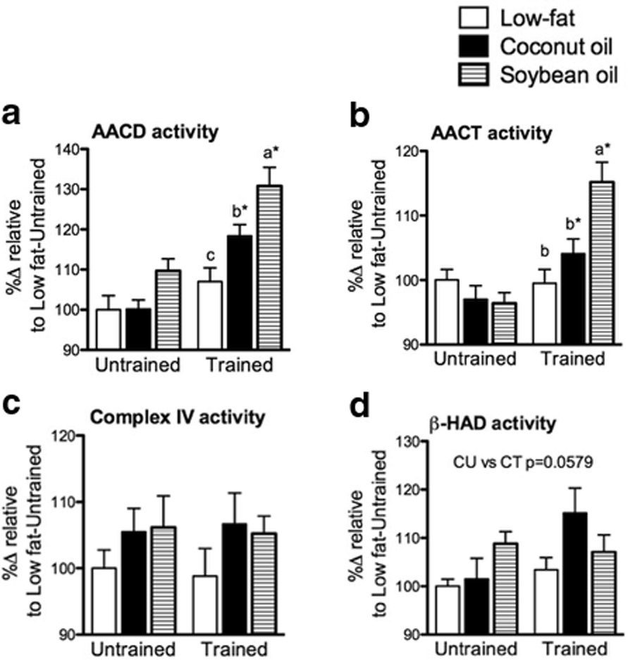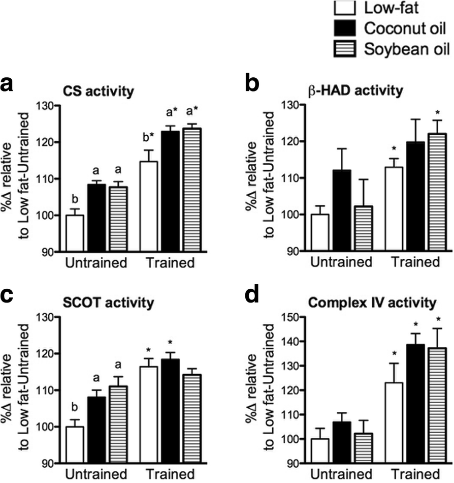 The effects of short- and long-term feeding of MCFAs and LCFAs with or without training have been investigated. In our laboratory, MCFAs (coconut oil) improved swimming capacity in trained mice and increased mitochondrial enzyme activities relative to LCFAs (soybean oil) [