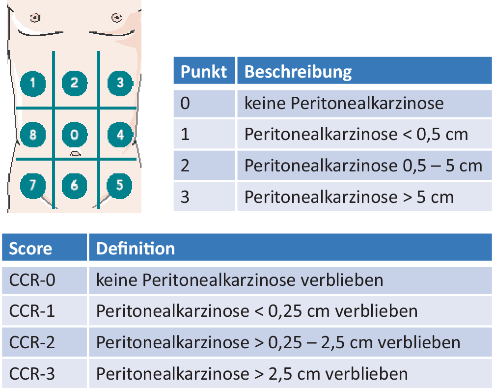 Darüber wird histologisch noch eine Unterscheidung von intraperitonealem, azellulärem Muzin (M1a) von zellulärem Muzin (M1b) vorgenommen. Prinzipiell kann bei einer CCR-0-Resektion eines PMP und dem Vorliegen einer M1a-Situation auf eine HIPEC verzichtet werden. Da der intraoperative Schnellschnitt mit der Bestimmung der Zellularität von Muzin oft Schwierigkeiten hat, ist die Abschätzung der Zellularität des Muzins im Rahmen der Operation keine praktikable Lösung. Mit den Patienten sollte daher bereits präoperativ die Durchführung einer HIPEC in Abhängigkeit des intraoperativen Krankheitsausmaßes besprochen werden.