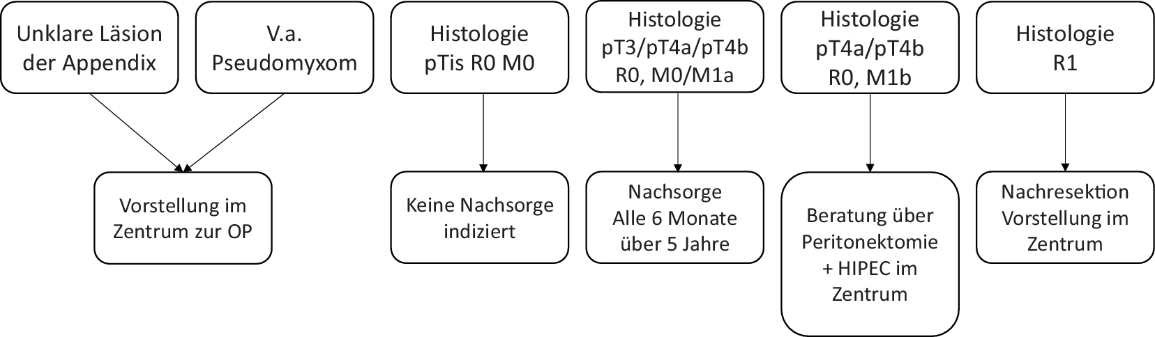 Sowohl bei bildmorphologischem Verdacht als auch nach Zufallsbefundung einer LAMN/PMP im Rahmen operativer Eingriffe wie der Appendektomie sollten die entsprechenden Patienten an ein Zentrum, das in der Therapie dieser Erkrankungsentität erfahren ist, angebunden werden. Die Diskussion der Patientenkasuistik zur Therapieplanung bzw. Festlegung der weiteren Surveillancestrategie im Rahmen einer interdisziplinären Tumorkonferenz ist obligat.