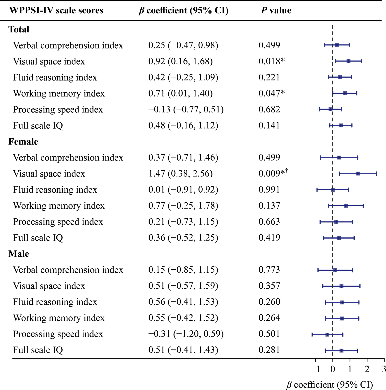 44] found that Bayley-III cognitive and language subscale scores in children at one and two years of age, particularly two years of age, were significantly and positively correlated with the WPPSI-IV VSI and WMI scores at three years of age. In general, visual–spatial and working memory skills are parts of cognitive development and are affected by early language development. Studies have confirmed that children with language impairment have greater difficulty in visuospatial tasks, indicating a strong relationship between the two domains [