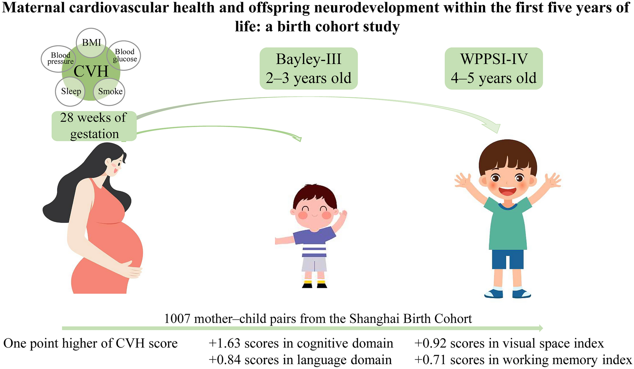 To fill this knowledge gap, the current study combined five metrics of CVH, including BMI, blood pressure, glucose level, sleep and smoking, and recruited mother‒child pairs from the Shanghai Birth Cohort (SBC) to elucidate the effects of combined maternal CVH during pregnancy on offspring neurodevelopment at 2–3 and 4–5 years of age.
