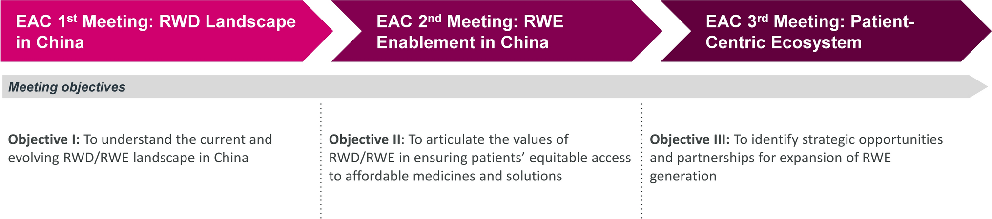 Experts’ presentations grouped by theme were summarized, including the RWD landscape in China, RWE enablement in China, and the patient-centric ecosystem to maximize the RWE/RWD value at a global level. Figure 1 shows an overview of the objectives of the three EAC meetings.
