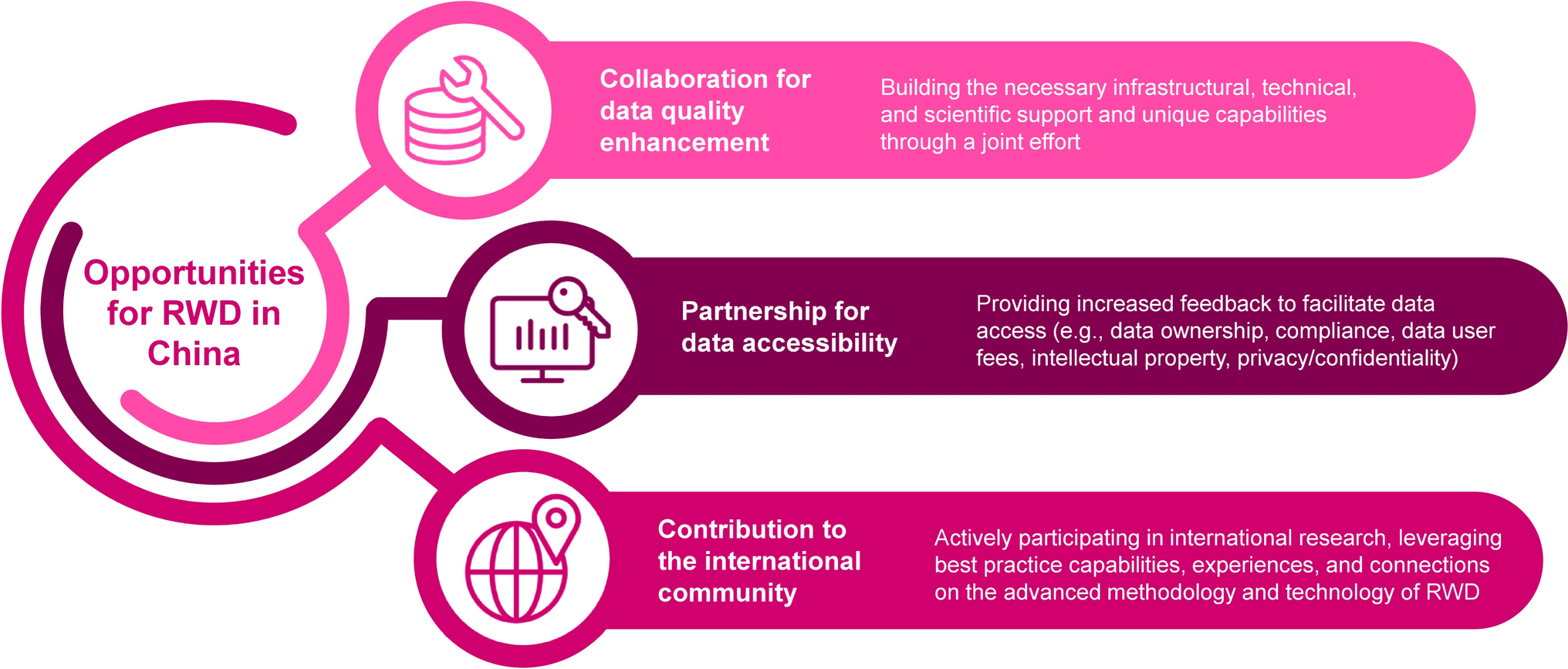 Fostering collaboration and sustainable partnerships across healthcare stakeholders is an opportunity to enhance RWD accessibility and quality. Through facilitating multi-stakeholder cooperation and building partnerships among government authorities, healthcare systems, academic researchers, and industry, the credibility of Chinese RWD can be improved distinctly as collaboration and partnership can provide the necessary infrastructural, technical, and scientific support and unique capabilities through a joint effort. The more players that join in the use of RWD, the better RWD will become, with high quality and accessibility.