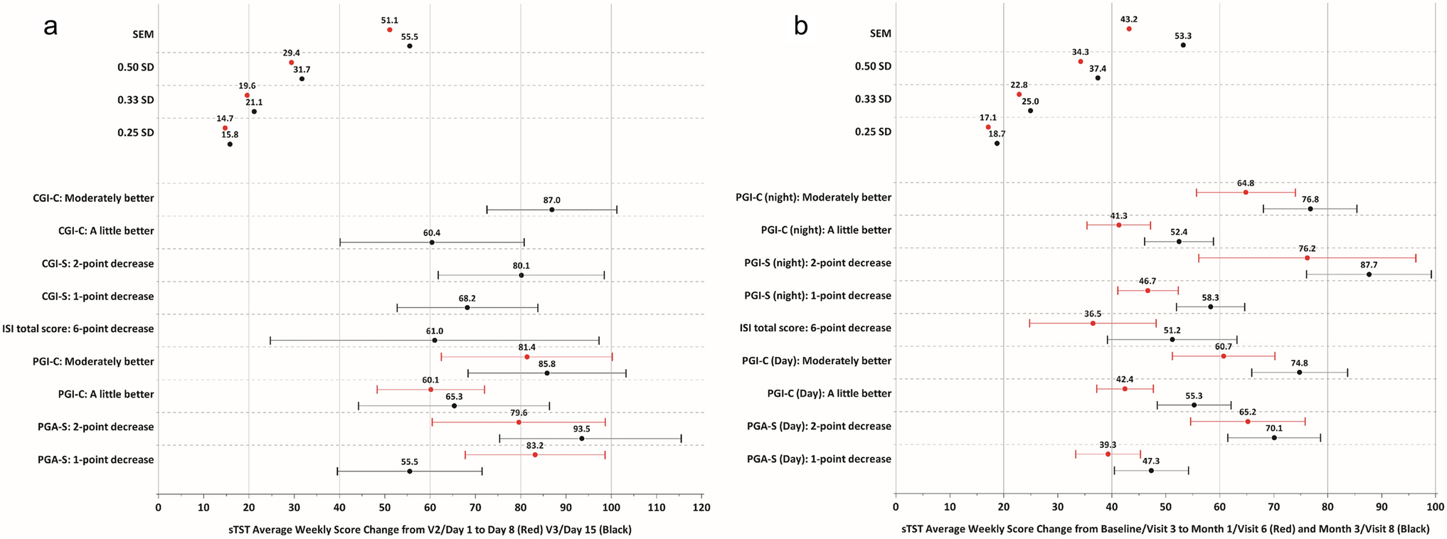 Triangulation of sTST changes from anchor- and distribution-based analyses for the a open-label trial and b phase III trial. Data are the mean (95% confidence interval) change in weekly average sTST (min) from baseline to day 8 (red) and baseline to day 15 (black) in the open-label trial, and from baseline to month 1 (red) and baseline to month 3 (black) in the phase III trial. CGI-C Clinician Global Impression of Change, CGI-S Clinician Global Impression of Severity, ISI Insomnia Severity Index, PGA-S Patient Global Assessment of Disease Severity, PGI-C Patient Global Impression of Change, PGI-S Patient Global Impression of Severity, SD standard deviation, SEM standard error of measurement, sTST subjective total sleep time
