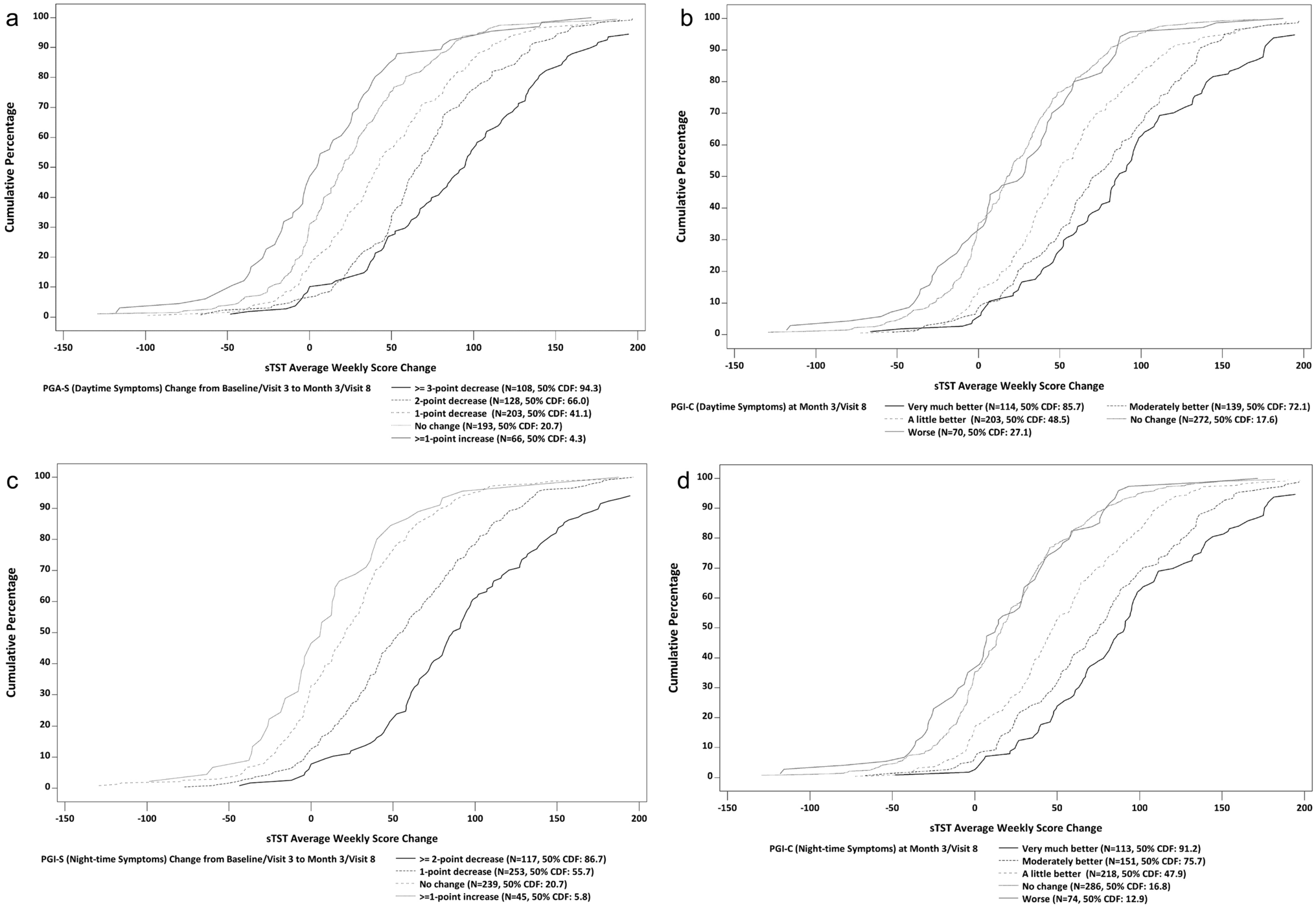 In addition, cumulative distribution function (CDF) curves for sTST were plotted using data from subgroups of subjects categorized based on score changes on the PGA-S, PGI-S, and CGI-S, and ratings for the PGI-C (daytime and night-time symptoms) and CGI-C. In these CDF curves, the x-axis represents a continuous plot of subjects’ change from baseline in weekly average sTST, from the greatest worsening to the greatest improvement, and the y-axis shows the cumulative percentage of subjects who attained that level of change.