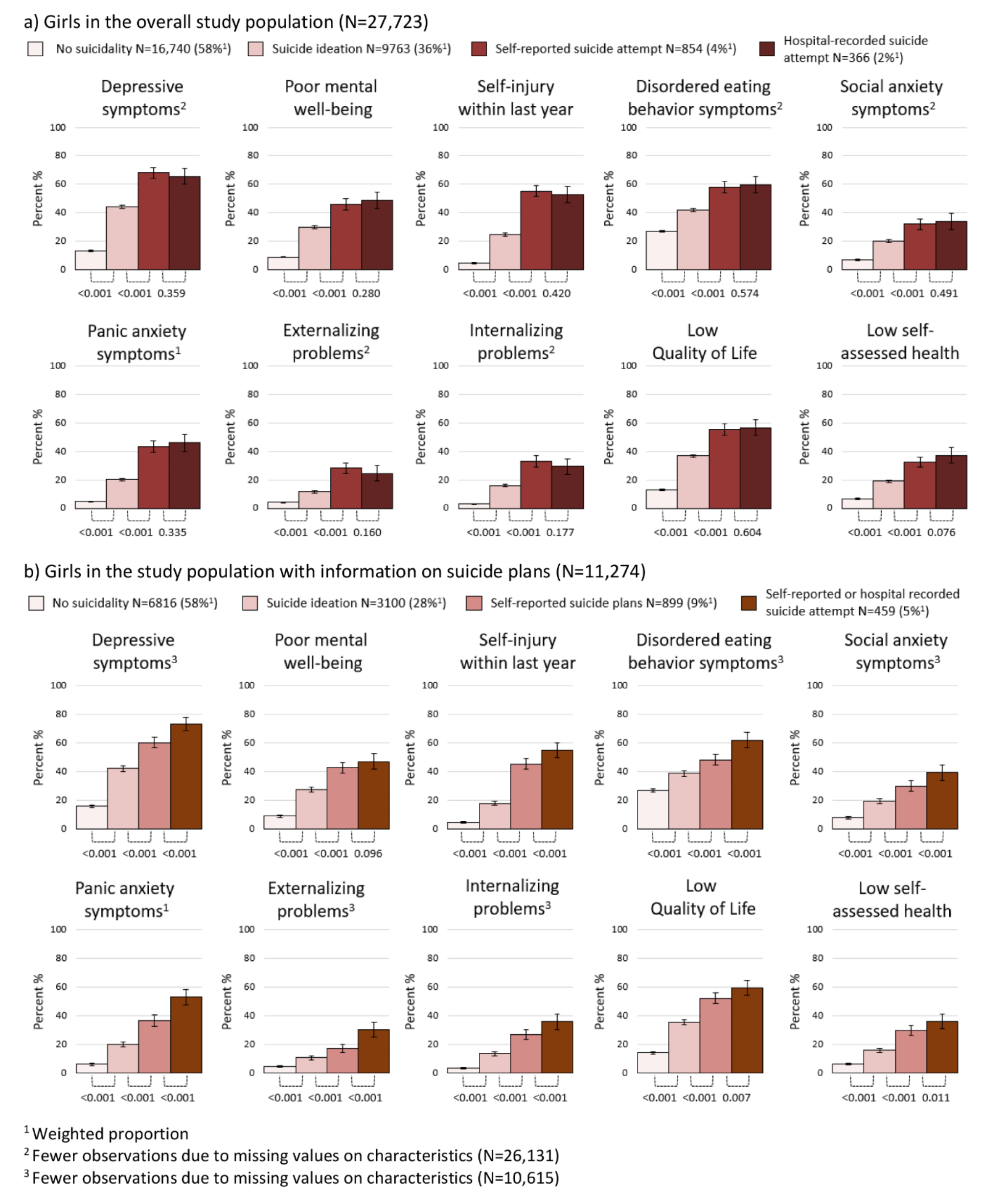 Depressive symptoms were reported by 14% (95% CI 13%;14%) of girls with no suicidality, 44% (95% CI 43%;45%) of girls with suicide ideation, and 68% (95% CI 65%;72%) 66% (95% CI 60%;72%) of girls with self-reported suicide attempt or hospital-recorded suicide attempt respectively. Among boys, depressive symptoms were reported by 5% (95% CI 4%;5%) of those with no suicidality, 27% (95% CI 26%;28%) of those with suicide ideation, and 51% (95% CI 45%;57%) and 40% (95% CI 22%;58%) of those with self-reported suicide attempt or hospital-recorded suicide attempt respectively. Likewise, other aspects of poor mental health and well-being gradually increased relative with more severe forms of suicidality, while no notable differences were identified between adolescents with self-reported and hospital-recorded suicide attempt. Similar tendencies were observed for risk behaviors and social life factors.