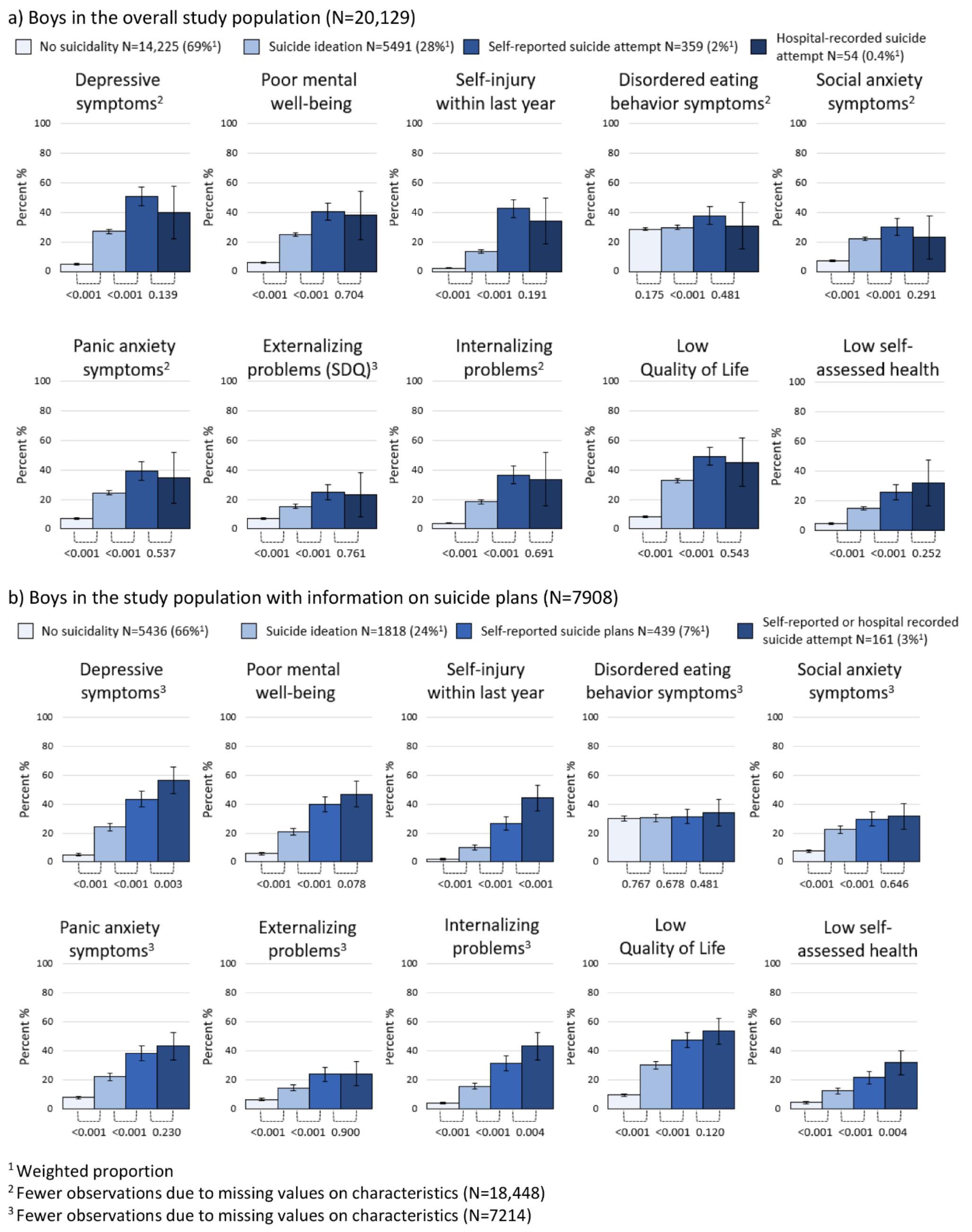 In the main analyses, all factors of poor mental health and well-being, risk behavior and social life factors were examined as binary variables. Characteristics based on scales were dichotomized according to previous literature [18, 21, 22, 25‐28, 31]. Weighted proportions were calculated for adolescents with no suicidality, self-reported suicide ideation, plans and attempts, and hospital-recorded suicide attempt with their corresponding 95% confidence intervals (95% CI). Similarly, weighted proportions were calculated for no, past, and current suicidality. P-values based on chi-square tests were used to compare: (1) no suicidality vs. suicidal ideation, (2) suicidal ideation vs. self-reported suicide attempt, and (3) self-reported suicide attempt vs. hospital recorded suicide attempt. Similar tests were performed for the sub-group analyses. All analyses were stratified by sex.