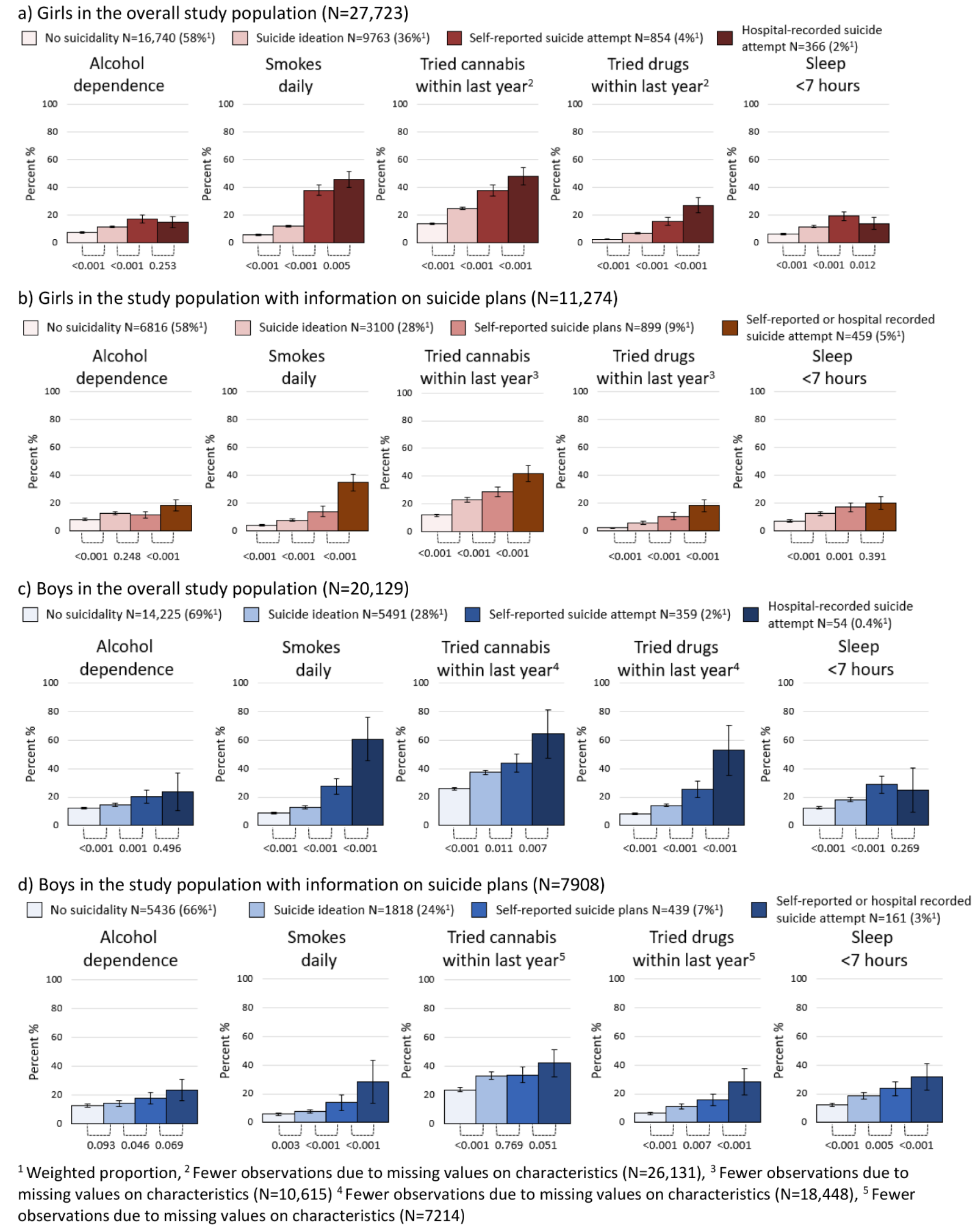 Risk behaviors were more frequent among girls who reported more severe forms of suicidality (Fig. 3). The same was found for the sub-population where information on suicide plans was available. Smoking, cannabis use, and drug use were more common among girls with hospital-recorded suicide attempts when compared to those with self-reported attempts. Similar patterns were observed among boys. A larger share of boys with more severe forms of suicidality reported smoking, drug use, and sleep deficiency, also when including suicide plans plan.