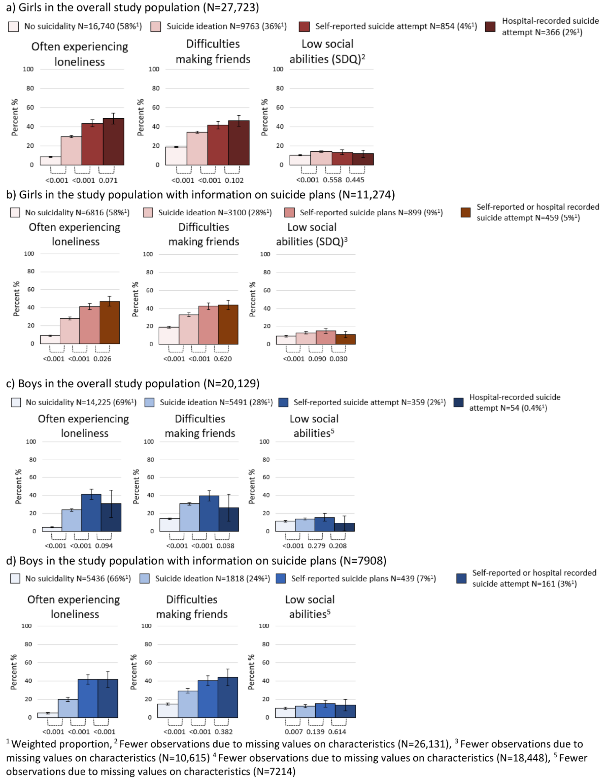 Individuals considered to have more severe forms of suicidality more frequently reported loneliness and difficulties making friends (Fig. 4). For both sexes, no notable differences among adolescents with suicidality were observed with regard to low social abilities.