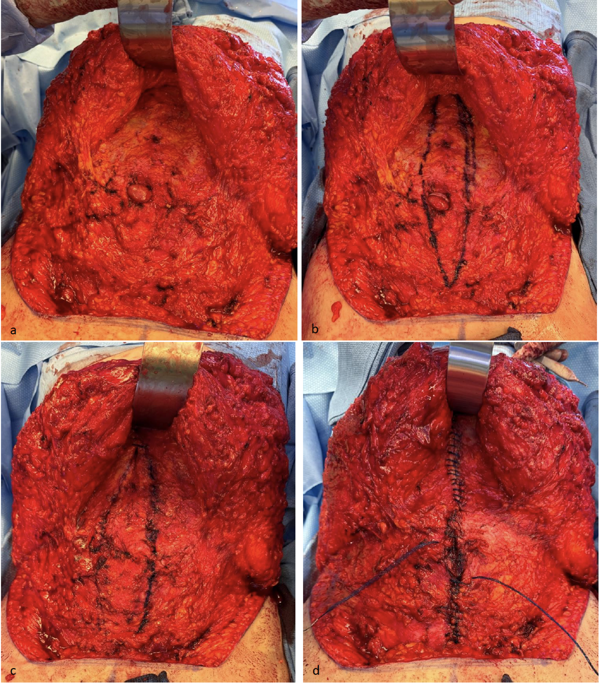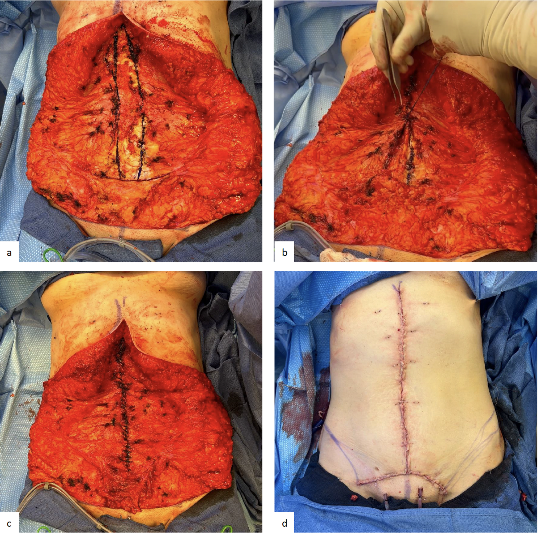 Surgical technique of mesh suture plication of 38-year-old woman with extraction site hernia and severe RD with low transverse incision (a) abdominal skin flaps lifted revealing diastasis of the abdominal wall and an incisional hernia (b) medial border of anterior rectus fascia is marked with surgical pen (c) incisional hernia is closed transversely prior to plication with absorbable, monofilament suture (d) plication of linea alba completed with two running mesh sutures that are then tied together and buried at the middle