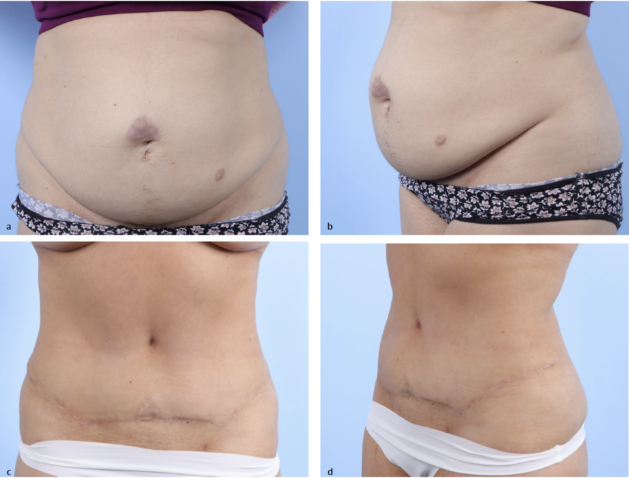 Pre (a, b) and postoperative (c, d) clinical photographs of 38-year-old female after abdominoplasty with mesh suture plication (Fig. 1) and extraction site hernia repair with low transverse skin incision