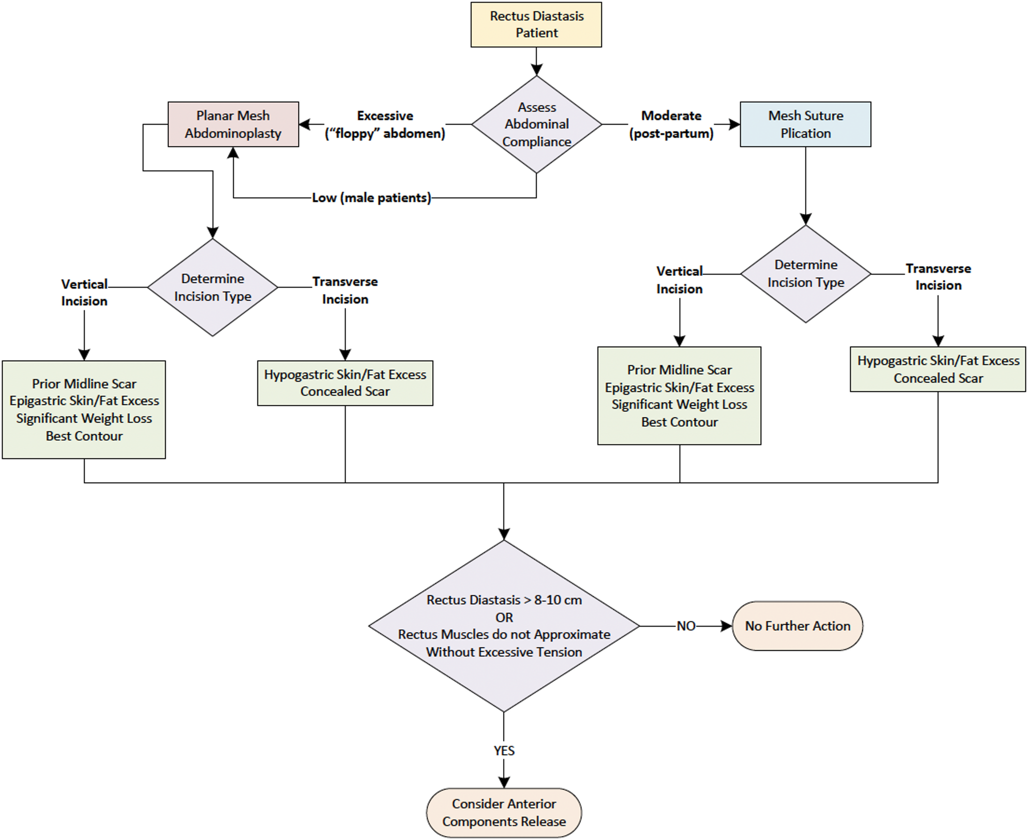 Surgical algorithm for RD with or without ventral hernia at our institution. Compliance is categorized as excessive, moderate, or low and guides the need for mesh reinforcement. Mesh suture plication is used in most moderately compliant cases; planar mesh or component separation is reserved for low compliance or wide rectus muscles. Incision type is based on scar location, tissue distribution, and contour goals. Mesh abdominoplasty = placement of well-fixed planar, polypropylene mesh in the retrorectus space along with mesh suture plication of the anterior rectus fascia