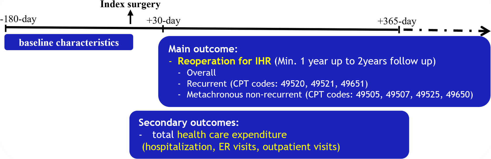 The primary outcome for this study was any metachronous reoperation for inguinal hernia repair from at least 30 days after the initial repair up to 2-years. Metachronous reoperations were identified using presence of any CPT code for IHR (recurrent repair: 49520, 49521, 49651, and other non-recurrent repair: 49505, 49507, 49525, 49650). Rates of recurrent inguinal hernia repair (49520, 49521, 49651) and non-recurrent inguinal hernia repair (49505, 49507, 49525, or 49650) were further assessed separately. Secondary outcomes assessed were total healthcare expenditure during the index operation, and up to 2 years after the initial repair. Expenditure was defined as total payments made by insurance and by patients out-of-pocket for healthcare services provided.