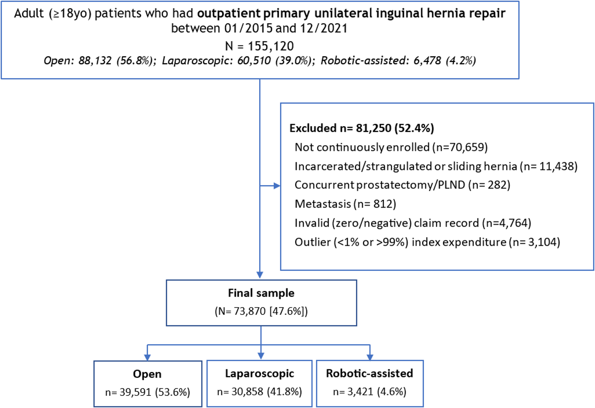Adult patients (≥ 18 years old) who underwent primary unilateral inguinal hernia repair (IHR) between January 2015 and December 2021 were queried from the outpatient claims dataset. Patients were included if records for continuous insurance coverage for 180 days before through 365 days after surgery were available (Fig. 1). Continuous insurance coverage was required to longitudinally follow patients and ensure baseline comorbidities and all healthcare visits before and after surgery were captured. Primary IHR were identified by the Current Procedure Terminology (CPT) codes 49,505, 49,507, and 49,650. Laterality of the repair was ascertained using the International Classification of Diseases (ICD) procedure codes and/or medical coding modifiers appended to CPT codes. Patients who had procedure code for bilateral repair, or codes for both right and left side procedure were considered to have undergone bilateral repair and were not included in the analysis. Furthermore, patients who had an incarcerated/strangulated or sliding hernia repair or had concomitant pelvic procedures (prostatectomy or pelvic lymph node dissection) were excluded. Codes used for patient identification are provided in the appendix (eTable 1).