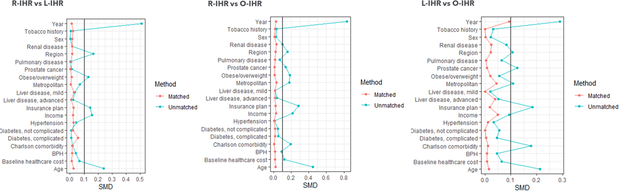 Descriptive statistical analysis of baseline patient demographic and clinical characteristics was conducted overall and by surgical approach. To adjust for differences in patient characteristics and minimize risk of sample selection bias, a one-to-one propensity score matching (PSM) was performed using the nearest-neighbor matching without replacement technique for comparing outcomes by surgical approach for each comparison pair (R-IHR vs. L-IHR, R-IHR vs. O-IHR, and L-IHR vs. O-IHR). Age, sex, area-level income, region of residence, metropolitan residence status, type of health insurance plan, year of surgery, Charlson comorbidity score, BPH, prostate cancer, tobacco abuse or history, obese/overweight status, and prior healthcare expenditure were included as covariates in logistic regression models performed to generate propensity scores. A standardized difference of < 0.1 was used to assess whether covariates balance was achieved between matched pairs.