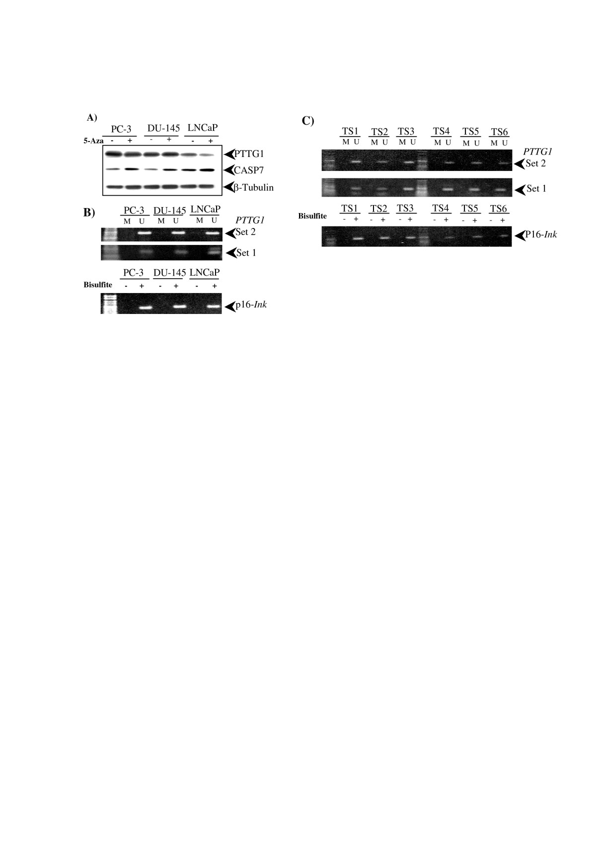 Methylation analysis of PTTG1 expression. A) Western blotting analysis of each cell line cultured in the presence or absence of 5-Aza. B) MSP analysis of tumor cell lines. Converted DNA is subjected to three different PCR reactions. For each primer set, two primer pairs are used to determine if the PTTG1 locus is methylated (M) or unmethylated (U). Bisulfite conversion control is performed by amplifying p16-Ink locus. C) MSP analysis of tumor samples with low (TS1-3) or high PTTG1 expression levels (TS4-6).