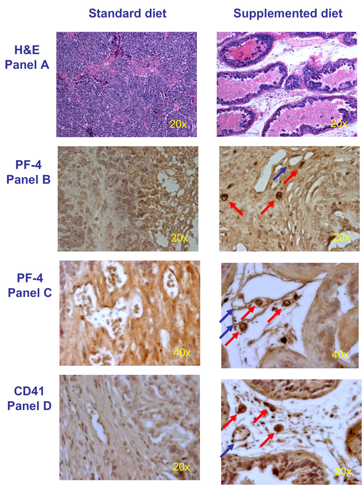 13]. Prostate glands were fixed in 10% (v/v) buffered formalin, paraffin-embedded and cut into 5 μm sections mounted onto glass slides. The sections were deparaffinized with xylene, rehydrated and boiled for 10 min in citrate buffer (pH 7.0). They were then blocked with 0.3% hydrogen peroxide in methanol followed by normal serum and then incubated overnight at 4°C with the primary antibody against mouse PF-4 (anti-PF-4, mouse monoclonal antibody (Santa-Cruz Biotechnology) diluted 1:70 in PBS) or against anti-CD41 (anti-CD41, rat monoclonal antibody (Abcam) diluted 1:50 in PBS). Slides were then reacted with biotin-labeled anti-mouse IgG/anti-rat IgG and incubated with preformed avidin-biotin peroxidase complex (Vector Laboratories). Sections were counterstained with hematoxylin, dehydrated, and mounted. The expressions of both PF-4 and CD41 were scored based on the intensity of staining (absence of staining, weak or strong) by two independent investigators.