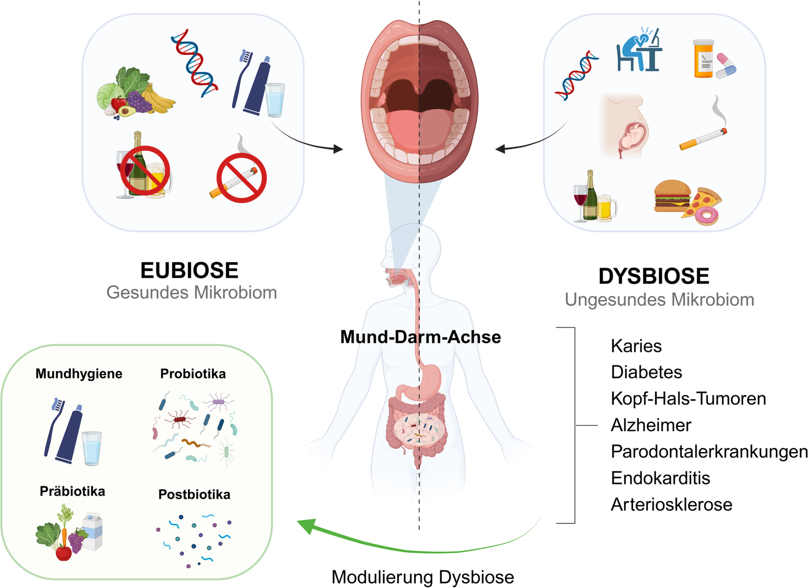 Eubiose und Dysbiose des oralen Mikrobioms und des Darmmikrobioms: Verschiedene Faktoren beeinflussen das orale Mikrobiom, welches wiederum das Darmmikrobiom über die Mund-Darm Achse beeinflussen kann. Eine Dysbiose kann verschiedene Erkrankungen begünstigen. Dies kann jedoch moduliert werden, um ein mikrobielles Gleichgewicht wiederherzustellen. (Erstellt mit BioRender.com)