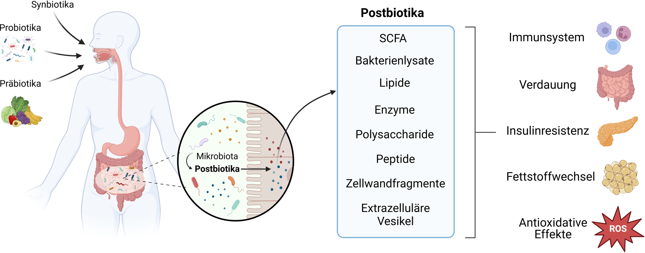 Entstehung von Postbiotika: Postbiotika werden durch Mikrobiota produziert und können über die Darmschleimhaut aufgenommen werden. Postbiotika sind in der Lage, verschiedene Erkrankungen zu beeinflussen, da sie auf das Immunsystem, den Fettstoffwechsel, die Verdauung und die Insulinsensitivität wirken. Darüber hinaus weisen Postbiotika auch antioxidative Effekte auf. SCFA „short-chain fatty acids“, ROS „reactive oxygen species“. (Erstellt mit BioRender.com)