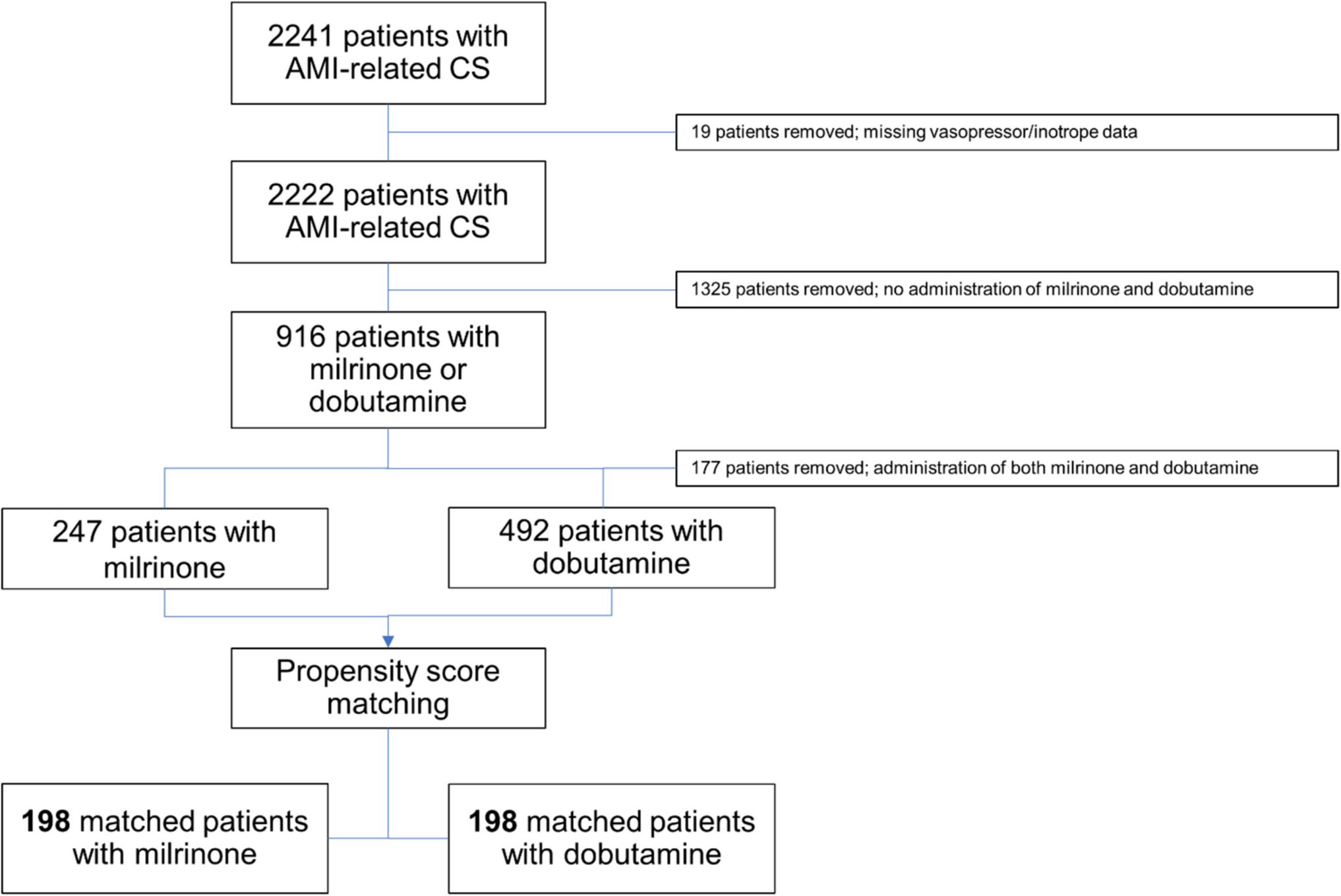 n = 65) being AMI-CS patients, the effects of these two inotropes on outcomes in AMI-CS remain unclear. Therefore, we aimed to identify patient characteristics associated with treatment with milrinone and dobutamine and to assess their effects on 30-day mortality in a large real-world cohort of AMI-CS patients.
