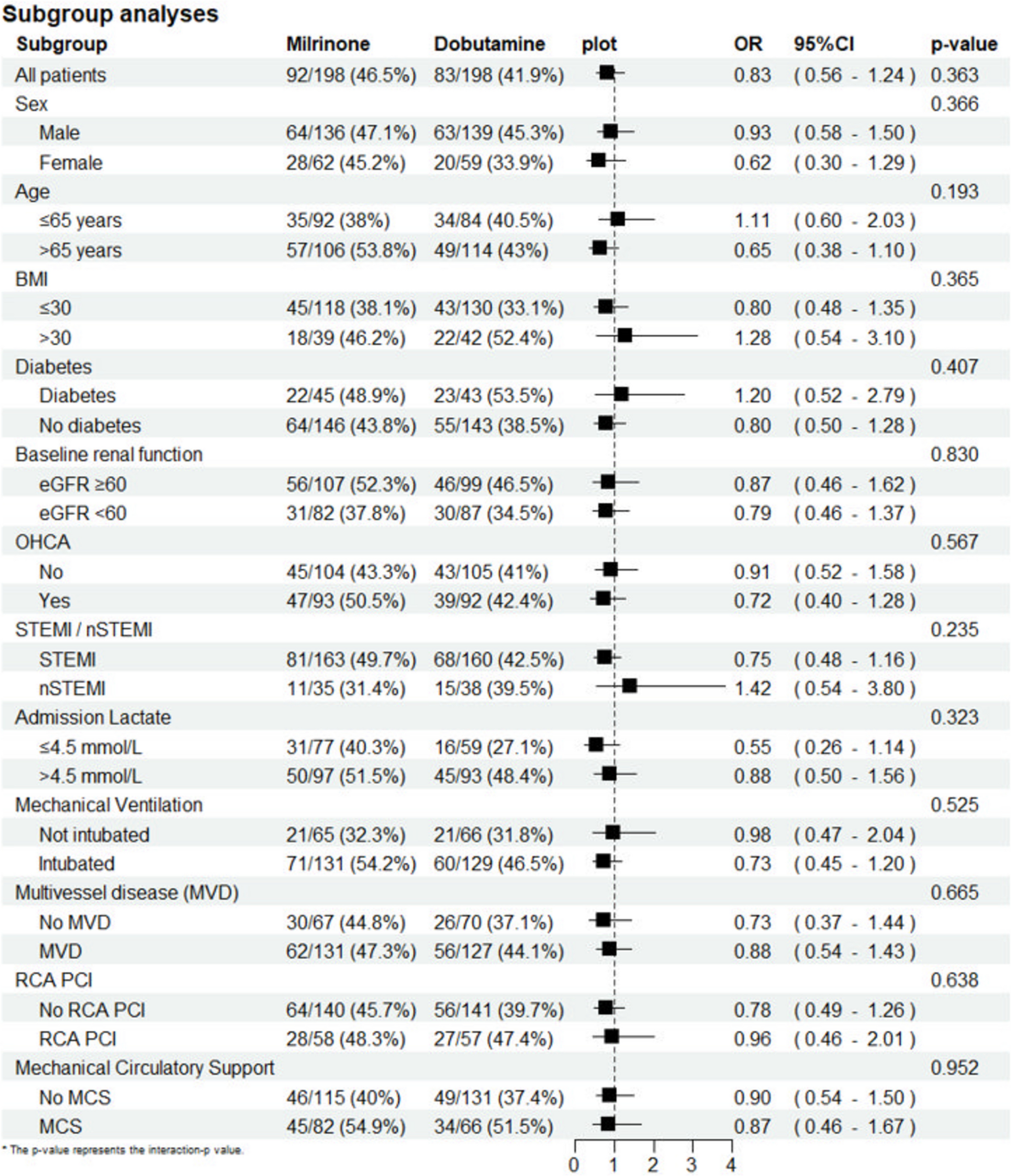 In the matched cohort, no association was found between treatment and mortality in any of the subgroups. Even among patients who underwent PCI of the right coronary artery (RCA), who might be expected to benefit most from milrinone, no difference was observed. However, RCA infarctions can also cause both severe hypotension and atrioventricular node block, in which case dobutamine may be preferred. These nuanced distinctions cannot be assessed with the existing data in this study. In the DOREMI trial, no mortality differences were observed in a small subgroup of patients with right ventricular involvement as well [