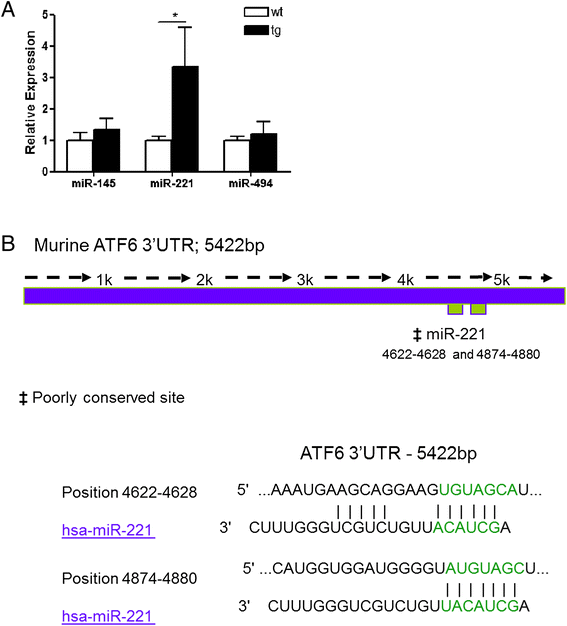 13]. Here, we extend our understanding of miR-145 and miR-494 in the context of CF bronchial epithelial cells by demonstrating their reciprocal relationship with ATF6 mRNA levels and provide evidence that miR-221 also contributes to the post-transcriptional regulation of ATF6. Regarding the expression of other miRNAs with a proven role in regulating ATF6 [
