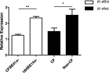 Total RNA was extracted using TriReagent (Sigma-Aldrich, St. Louis, MO, USA). Generation of cDNA for miRNAs of interest was performed using Taqman MicroRNA Reverse Transcription kits (Applied Biosystems, Foster City, CA, USA). miRNA expression in brushings and cell lines was measured on a Roche LC480 Lightcycler (Roche, Penzberg, Bavaria, Germany). Expression of miRNAs relative to miR-218 was determined using the 2(−ΔΔCt) method. miR-218 was chosen for normalisation due to a high degree of similarity in expression levels between CF and non-CF brushings observed in the expression profiling screen. All quantitative real-time polymerase chain reaction (qRT-PCR) experiments in cell lines were performed in triplicate, a minimum of three times and included no-template controls.