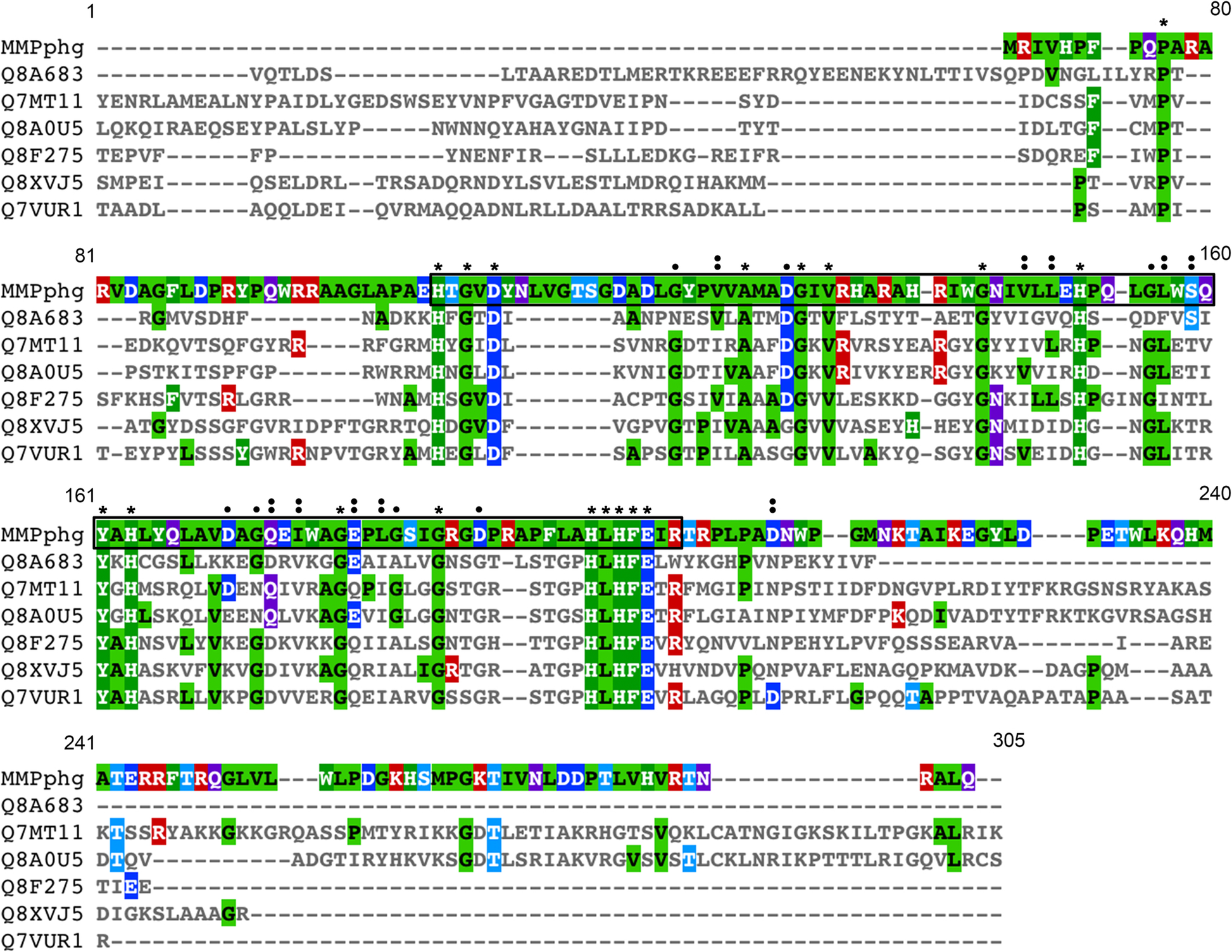 Multiple sequence alignment of MMPphg and other six representatives of M23 peptidase family. The alignment was carried out with CLUSTAL Omega (1.2.4). An asterisk (*) indicates positions that have a single, fully conserved residue, while colon (:) and period (.) denote conservation among groups of strong similarity and weak similarity, respectively. The amino acid residues of MMPphg within M23 peptidase domain were boxed. The UniProtKB/Swiss-Prot accession numbers Q8A683, Q7MT11, Q8A0U5, Q8F275, Q8XVJ5 and Q7VUR1 represent protein sequences of putative membrane peptidase from Bacteroides thetaiotaomicron, peptidase of M23/M37 family from Porphyromonas gingivalis, putative peptidase from Bacteroides thetaiotaomicron, peptidase of M23/M37 family from Leptospira interrogans, putative ipr002886 peptidase M23b family transmembrane protein from Ralstonia solanacearum and putative peptidase family M23/M37 protein from Bordetella pertussis, respectively. This figure was prepared with MView version 1.63