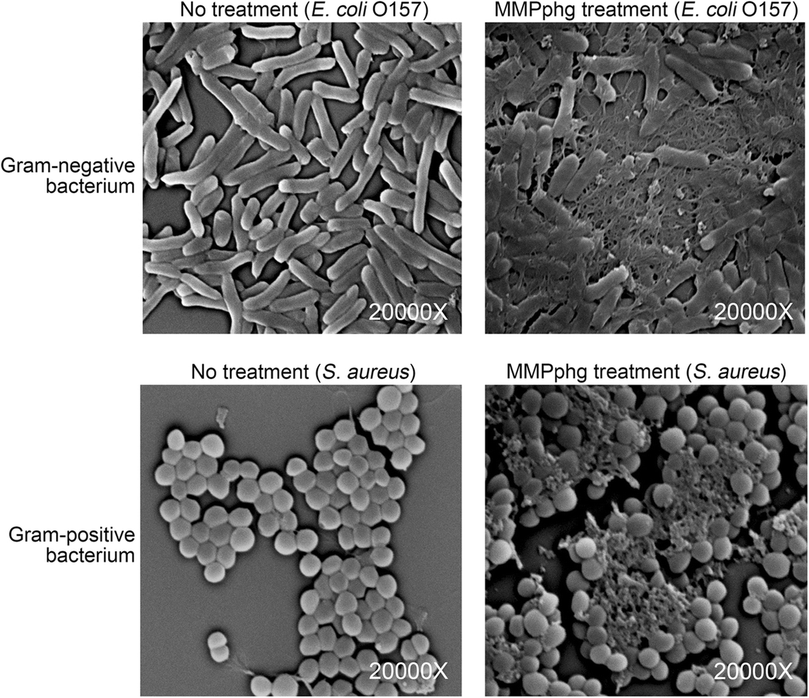 Scanning electron microscope showing the effects of exogenous MMPphg treatment on bacteria destruction of both Gram-negative (E. coli O157) and Gram-positive (S. aureus) cells. For all tests, 105 CFU/mL of bacterial cells were treated with or without 5 μM MMPphg at 37 °C for 1 h. The magnification is 20,000 times the original size