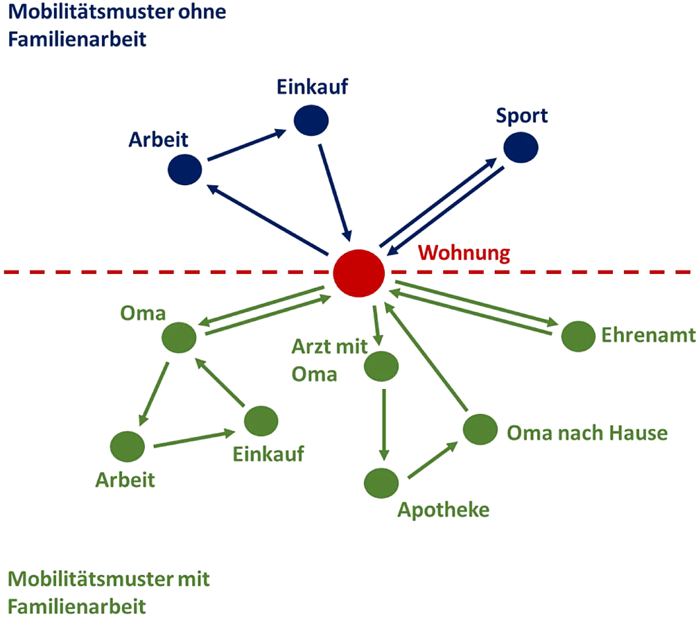 Mobilitätsmuster mit und ohne Familienarbeit – Wegeketten (Quelle: eigene Abbildung von Gisela Stete)