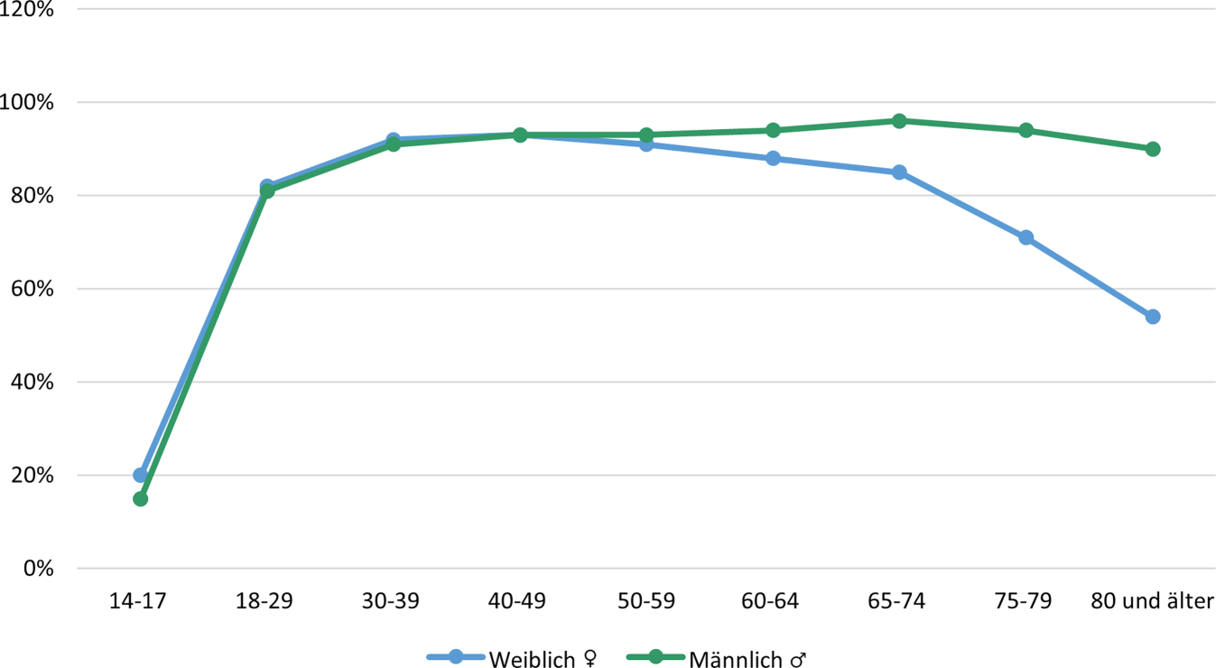 Danach sind die Unterschiede bei Führerscheinbesitz und Pkw-Verfügbarkeit im Alter bis 60 Jahre nicht signifikant. In den älteren Jahrgängen jedoch zeigte sich eine deutliche Diskrepanz zwischen den Geschlechtern: 54 % der Frauen, die älter als 80 Jahre waren, und 90 % der Männer, die älter als 80 Jahre waren, verfügten 2017 über einen Führerschein (Abb. 2).