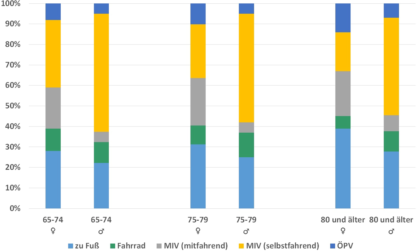 Daten zur Verkehrsmittelwahl und den zurückgelegten Distanzen aus MiD [10] zeigen, dass Seniorinnen eine deutlich höhere Nahraumorientierung haben als Senioren, d. h. täglich kürzere Strecken zurücklegen und dabei seltener selbst hinter dem Steuer sitzen. Sie sind eher zu Fuß, mit dem Fahrrad und mit öffentlichen Verkehrsmitteln oder als Beifahrerinnen unterwegs. Der Anteil der Seniorinnen, die häufiger zu Fuß unterwegs sind, ist trotz der höheren Anzahl hochaltriger Frauen in der Kohorte der älter als 80-Jährigen größer als der ihrer männlichen Altersgenossen. Hingegen ist die Fahrradnutzung bei den Seniorinnen und Senioren zwischen 65 und 74 nahezu gleich. Bei Senioren, die älter als 74 Jahre sind, ist die Fahrradnutzung höher als bei den gleichaltrigen Seniorinnen (Abb. 3). Gerade Seniorinnen zeigen öfter Unsicherheitsgefühle, wenn Fahrradwege zu schmal und/oder nicht vom Autoverkehr getrennt sind. Dadurch ist eine weitere Einschränkung der selbstbestimmten, von anderen Menschen unabhängigen Mobilität zu erwarten. Diese Befunde sind vor allem deshalb genderrelevant, weil die Zuständigkeit für Haus- und Versorgungsarbeit auch bei älteren Paaren oftmals bei den Frauen liegt und damit deren Mobilitätsbedarfe beeinflusst [2]. Dies wird z. B. an den Wegeketten deutlich, die auch bei älteren Frauen länger und differenzierter sind. So lagen bei der Untersuchung zu genderspezifischen Bedürfnissen von Mobilität im Kreis Stormarn der Anteil des Wegezweckes „Dienstleistung“ an allen Wegen der weiblichen Befragten älter als 67 Jahre mit 39 % deutlich über dem der männlichen Befragten älter als 67 Jahre mit 27 % [6].