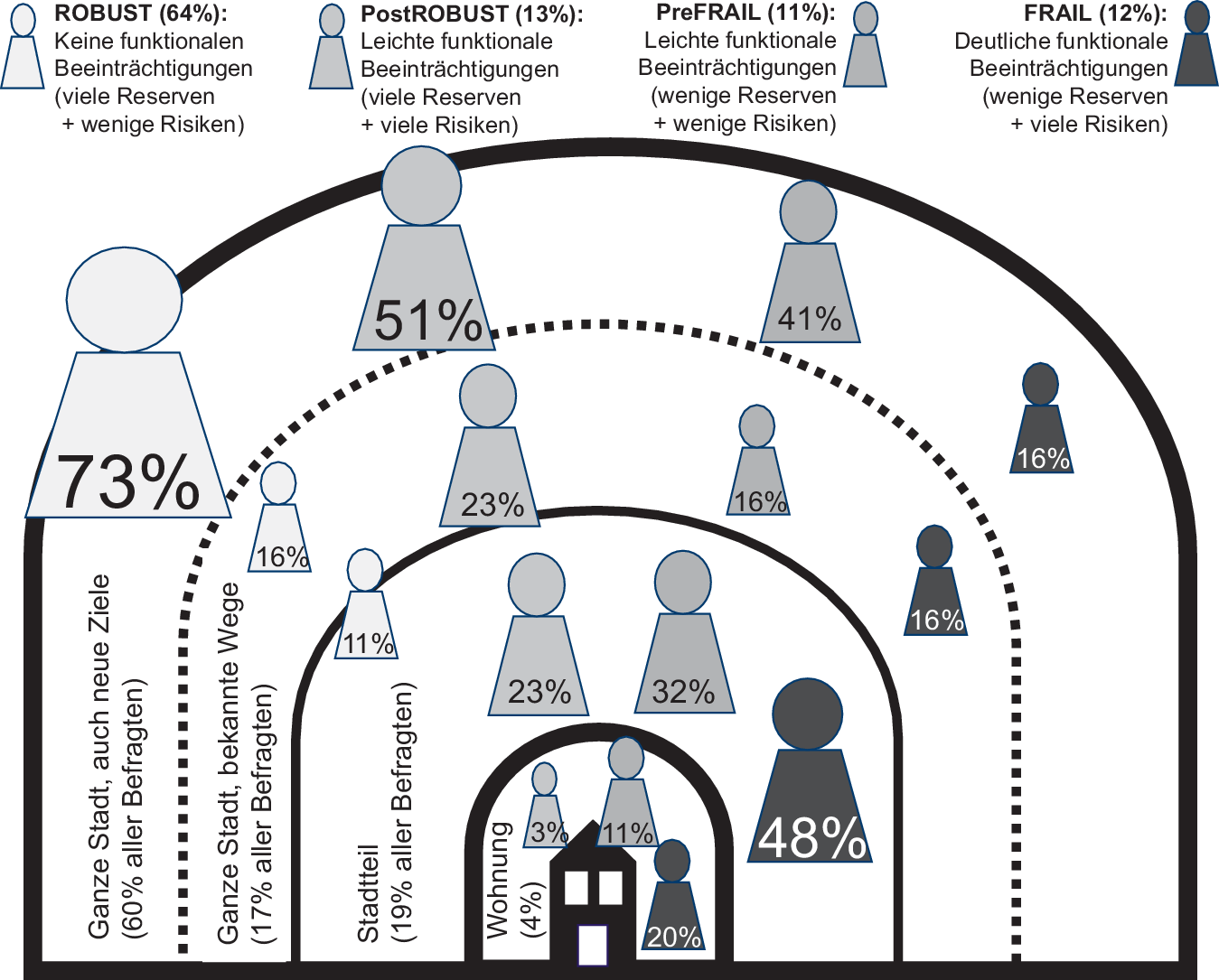 Erwartungsgemäß gaben als Robust klassifizierte Personen am häufigsten an, ohne Schwierigkeit zu gehen (95 %), Fahrrad zu fahren (78 %), den öffentlichen Personennahverkehr (ÖPNV) zu nutzen (86 %) oder selbstständig Auto zu fahren (66 %). Abgesehen von wenigen Personen gab diese Gruppe an, keine Schwierigkeit zu haben, selbstständig Aktivitäten außer Haus oder die hausärztliche Praxis zu besuchen, und nur etwa 4 % von ihnen gaben an, wegen Sturzangst Tätigkeiten geändert zu haben. Von den als Frail klassifizierten Personen gab nur ein gutes Drittel selbstständiges Gehen ohne Schwierigkeit an, Fahrradfahren 7 %, die Nutzung des ÖPNV 66 % und selbstständiges Autofahren 23 %. Die Hausarztpraxis oder Aktivitäten außer Haus selbstständig ohne Schwierigkeit zu besuchen gaben nur 38 % an. In dieser Gruppe hatte fast die Hälfte angegeben, gestürzt zu sein, und gut 70 % gaben Tätigkeitsänderungen wegen Sturzangst an. Weniger Personen mit Funktionsklasse postRobust/preFrail (mit zunehmenden Risiken und abnehmenden Reserven) als jene der Gruppe Robust gaben Gehen ohne Schwierigkeit, Fahrradfahren, selbstständiges Autofahren (40 %) und ÖPNV-Nutzung an. Nur gut 3 Viertel von ihnen gaben an, selbstständig ohne Schwierigkeit Aktivitäten außer Haus zu besuchen. Stürze nannten 26 % und ein Viertel gab an, Tätigkeiten wegen Sturzangst verändert zu haben.