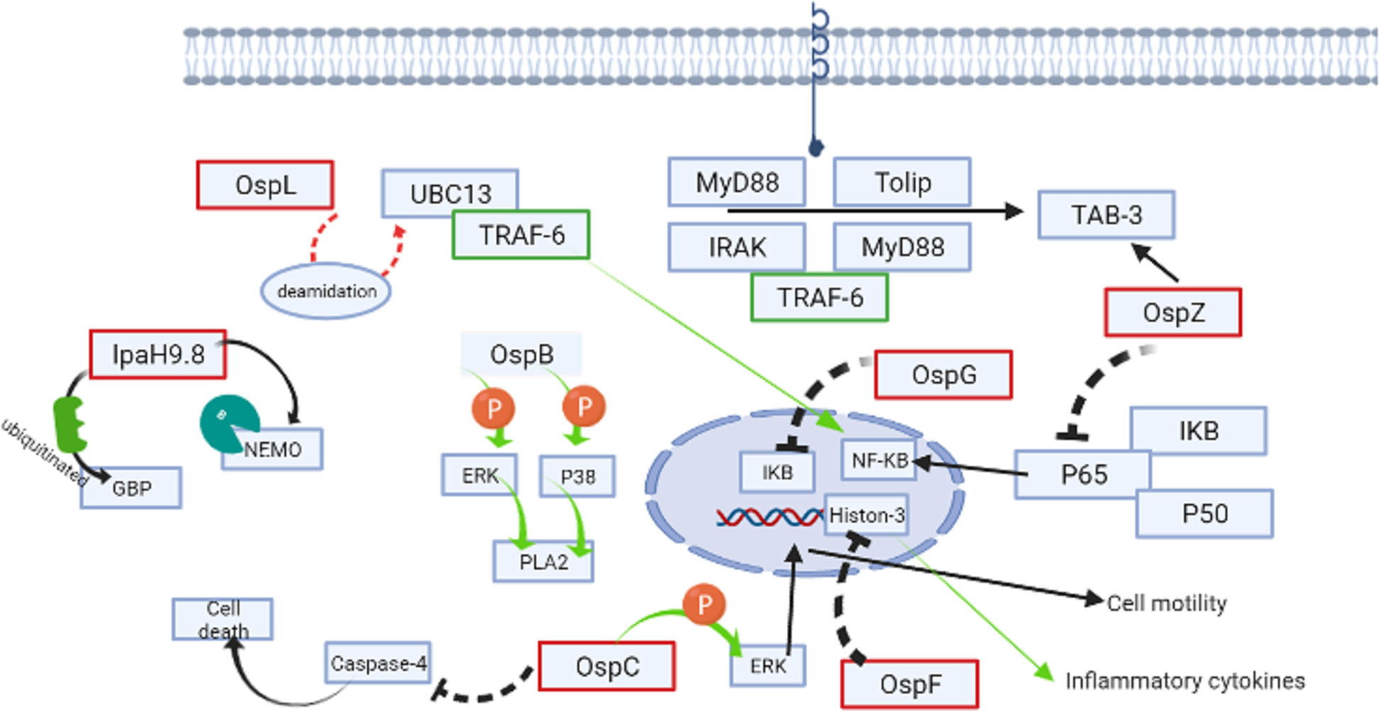 178]. OspF translocates to the nucleus and interacts with Histone-3 to control the expression of inflammatory cytokine. Phosphorylation of Histone-3 is necessary for chromatin availability to transcription factor NF-κB; thus, it inhibits Histone-3 phosphorylation by OspF and blocks the activation of a gene which is under the control of NF-κB [
